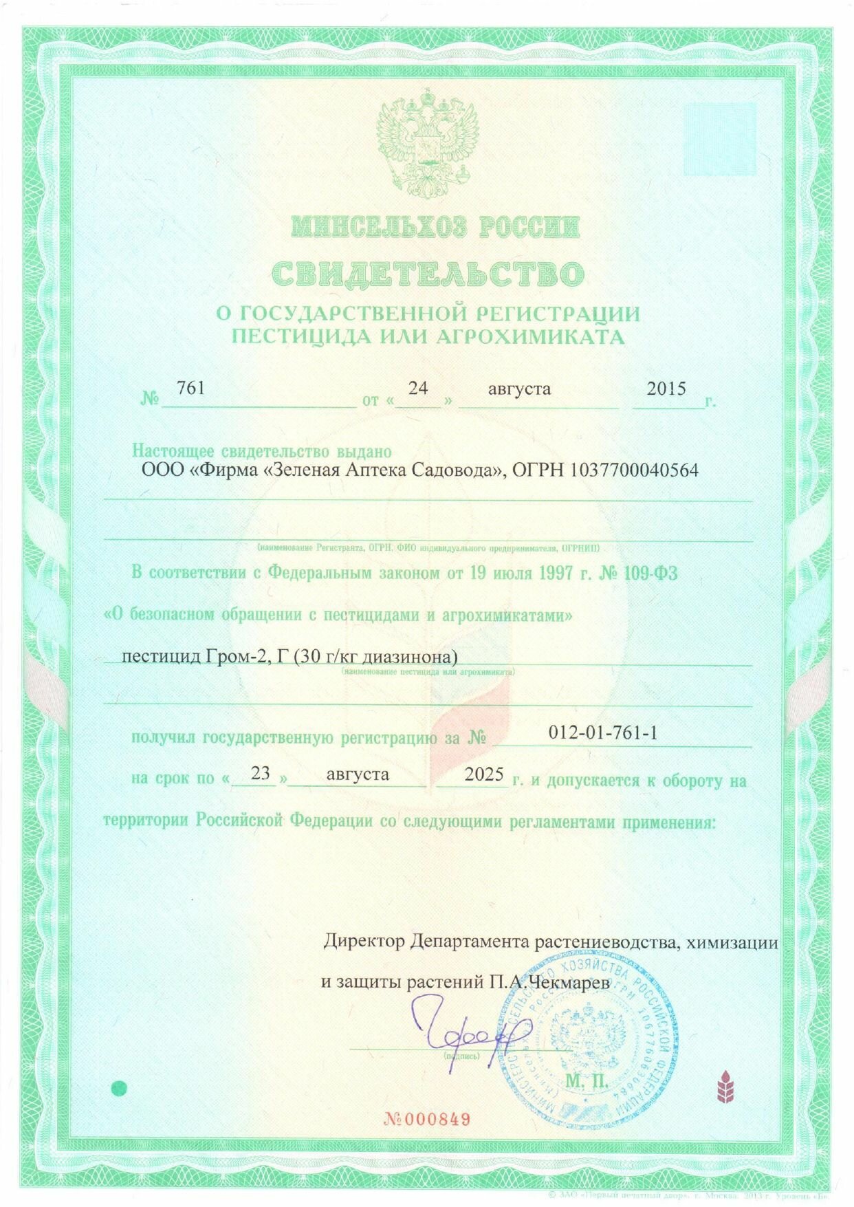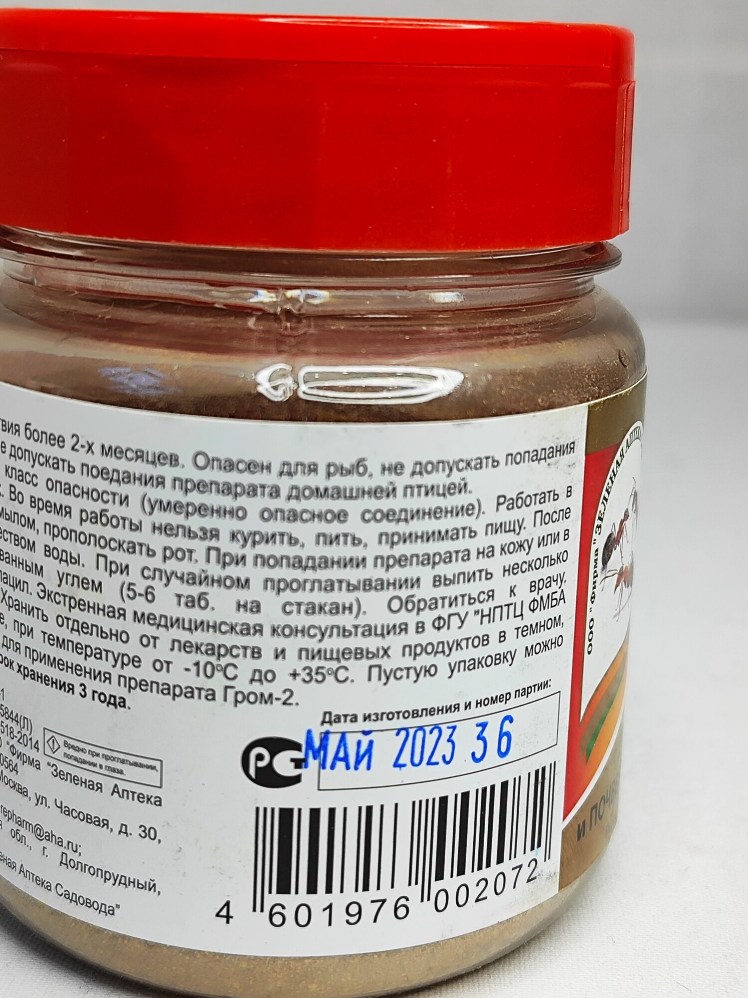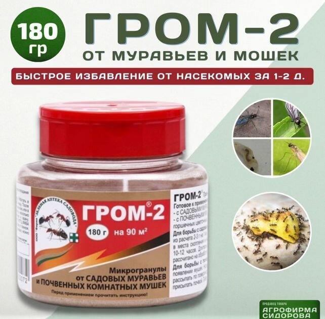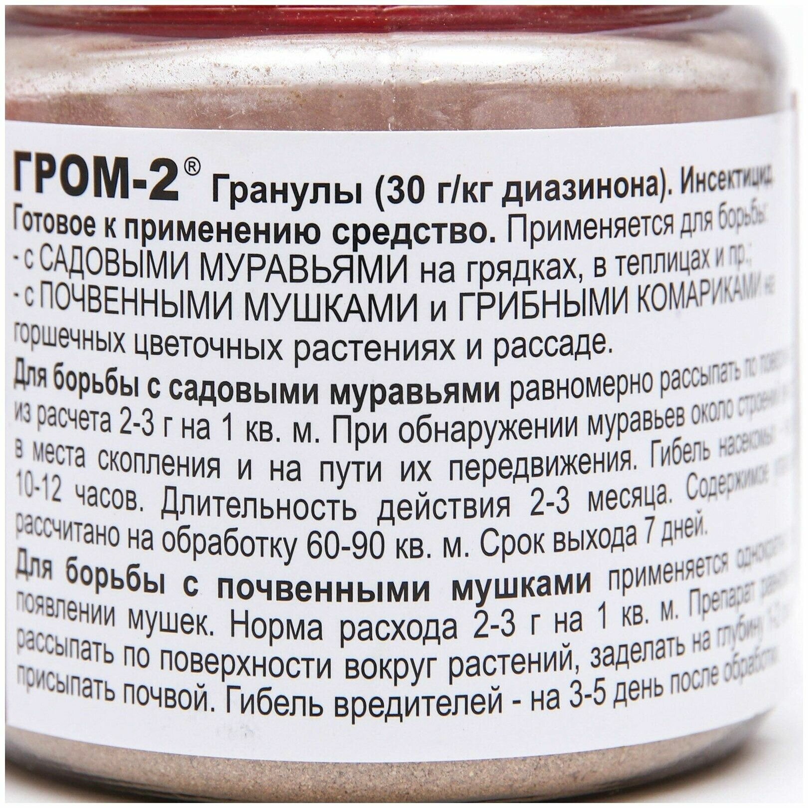 | Дополнительная информация | редство от муравьев «Гром-2» — химический инсектицид, предназначенный для истребления муравьев, почвенных мошек, грибных комаров в горшках комнатных растений и на приусадебном участке. Для достижения результатов необходимо внести препарат в толщу почвы на глубину 1–2 см по пути следования муравьев или в местах скопления насекомых. Муравьи гибнут спустя 3–5 дней после контакта с действующим веществом препарата. Защитное действие сохраняется 2–3 месяца, достаточно купить препарат 1–2 раза на сезон. Упаковки в 10 г хватает для обработки 8–10 м2 почвы. |