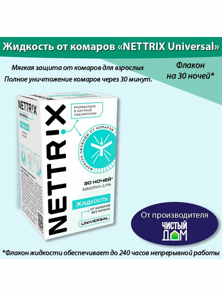 Жидкость от комаров Nettrix Universal, без запаха, 30 ночей