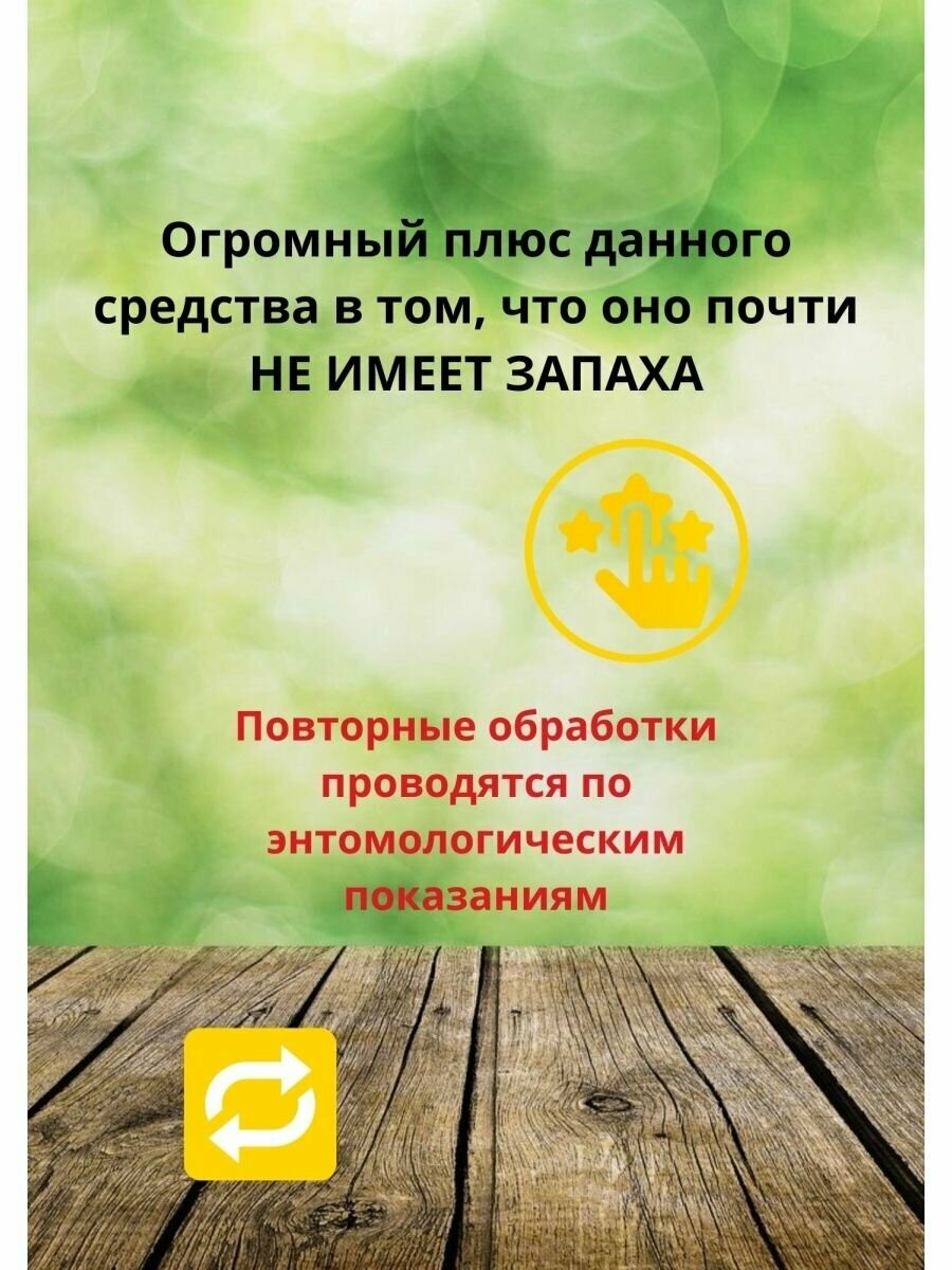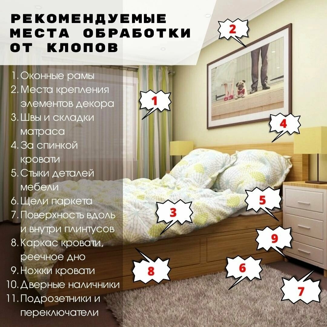 | Способ применения | Рабочий раствор готовится в соотношении 10 мл концентрата на 1 литр воды, при большой численности заряжения увеличивает соотношение до 20 мл на 1 литр. Для нанесения рабочей эмульсии используется распылитель, на места кладок яиц и скопления клопов наносить можно кистью. Если потребуется повторная обработка рекомендуется чередовать с другими препаратами, чтобы предотвратить привыкание клопов к препарату. Необходимо обработать: щели кроватей, диванов и низ мебели, швы матрасов, подушек, одеял, задняя сторона ковров, картин и бра, выдвижные полки прикроватных тумбочек и комодов, щели в плинтусах и радиаторы отопления, щели между обоями и отстающие их края, прикроватные выключатели и розетки (заранее обесточьте). Норма расхода готового раствора 100мл/1м2. |