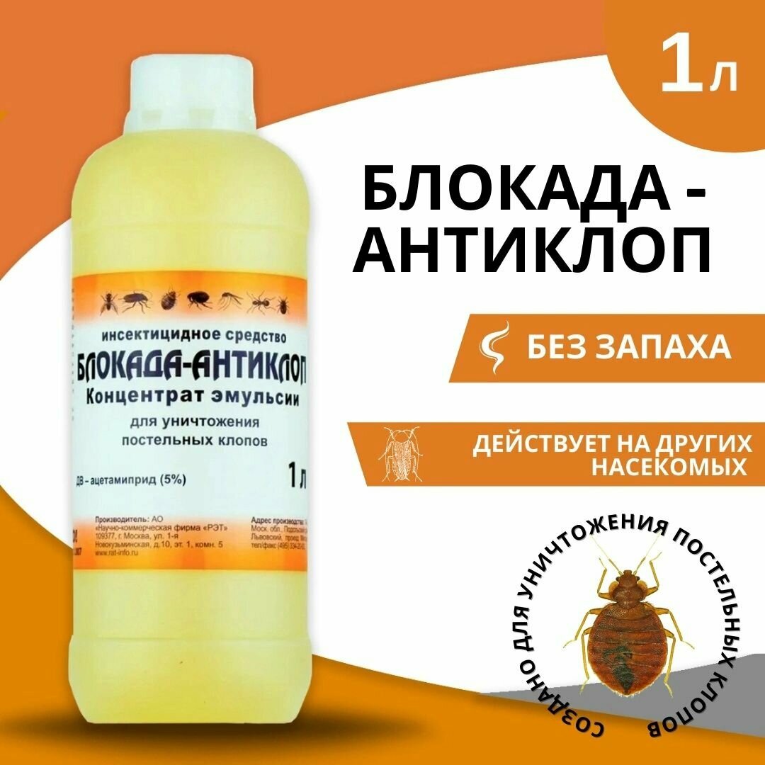 Ниже Вы можете прочитать отзывы на Блокада Антиклоп ВЭ 5%, средство от постельных клопов, блох и других насекомых, 1л, ознакомится с подробными характеристиками, посмотреть интересные обзоры и фотографии на Блокада Антиклоп ВЭ 5%, средство от постельных клопов, блох и других насекомых, 1л.