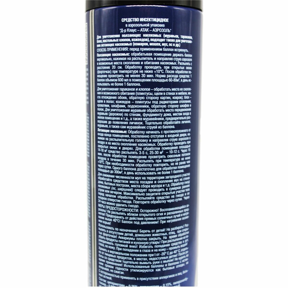 | Дополнительная информация | меры предосторожности: воспламеняющийся аэрозоль, не распылять вблизи открытого огня и раскаленных предметов, предохранять от действия прямых солнечных лучей и нагревания выше 40°С, баллон под давлением.,при нагревании возможен взрыв, использовать по назначению., беречь от детей., не разбирать, распылять в отсутствии детей, домашних животных, птиц, при открытых форточках, аквариумы плотно закрыть.,на время обработки убрать продукты питания и кухонную утварь, при распылении не переворачивать головкой вниз, избегать попадания средства в рот |