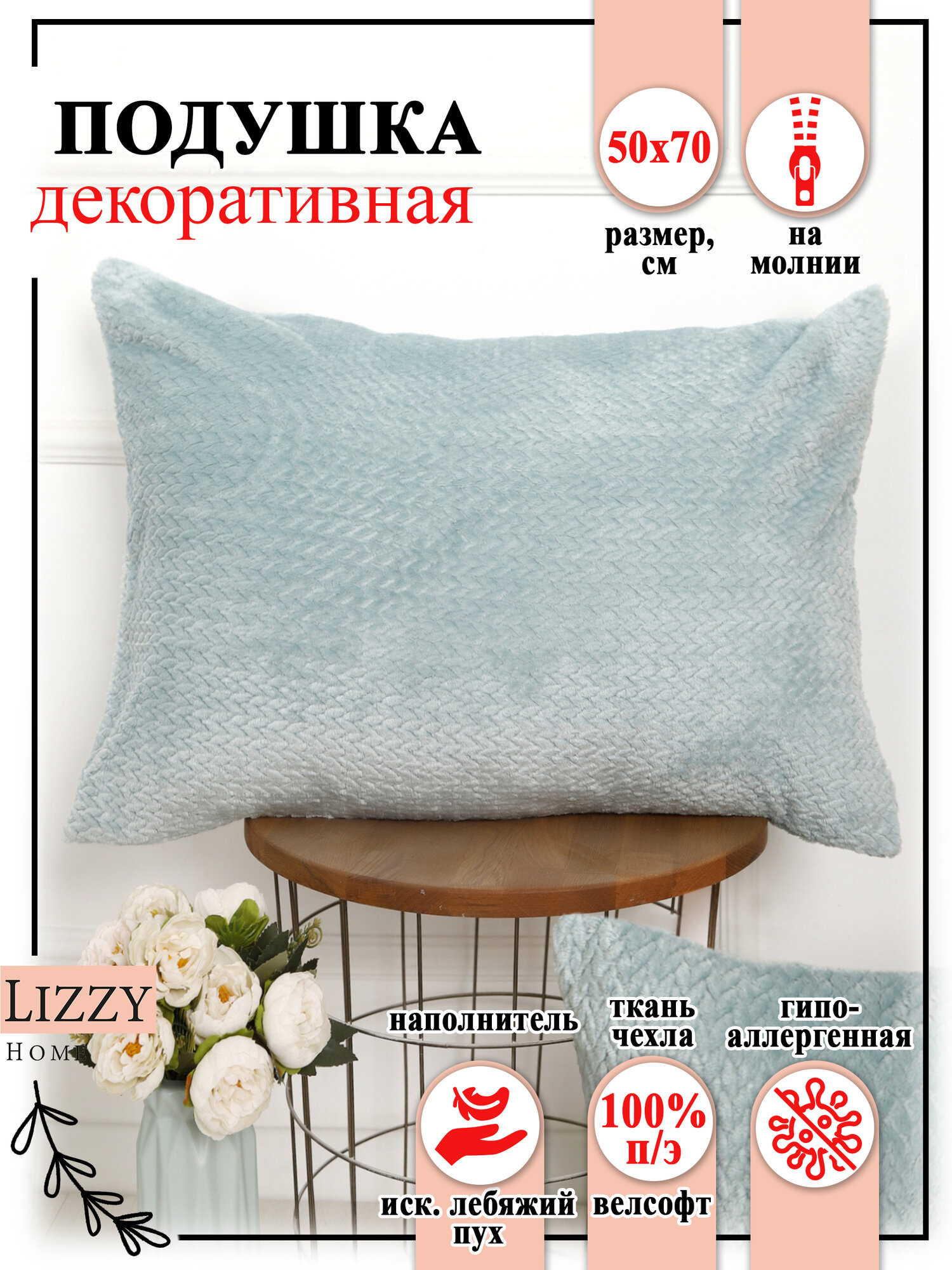 Декоративная подушка Lizzy Home, 50×70 см, съемный чехол, велсофт