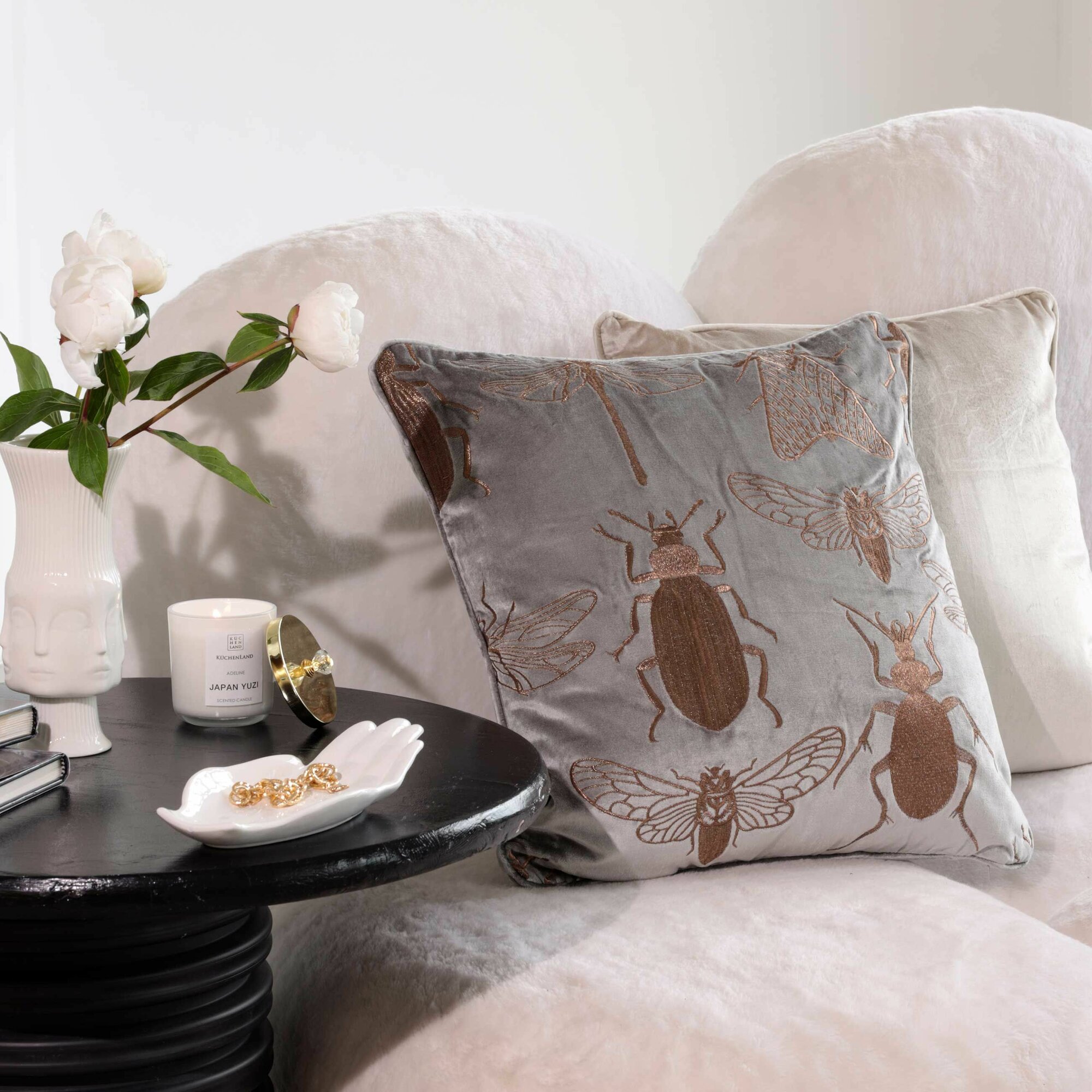 Купить Подушка декоративная, 50х50 см, вельвет, бежево-серая, Жуки, Bugs