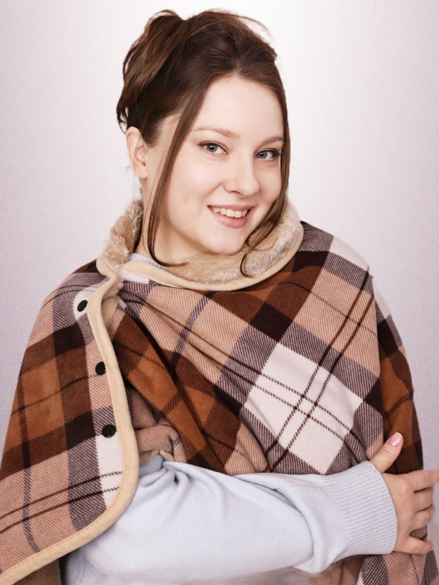 Плед пончо накидка 130х80 см, клетка, двухсторонний, на кнопках, подарочный