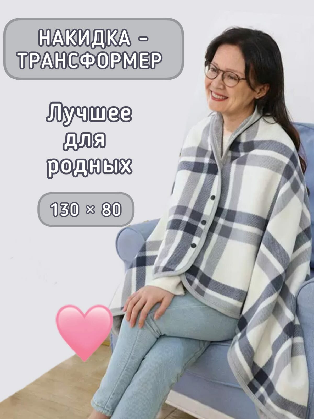 Плед пончо накидка 130х80 см, клетка, двухсторонний, на кнопках, подарочный