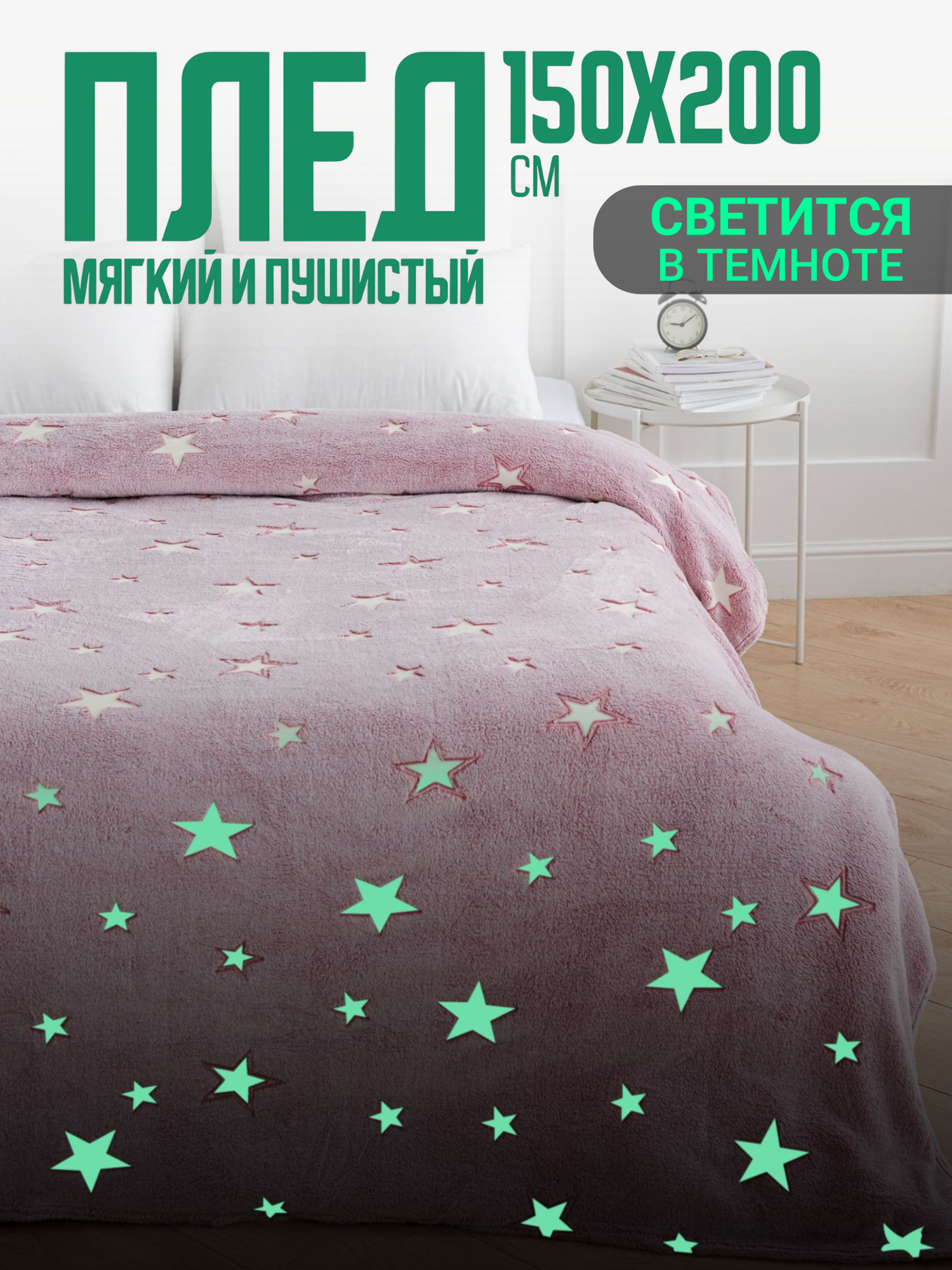 Плед 200х220 светящийся в темноте Павлина Звезды розовый (светонакопитель), евро