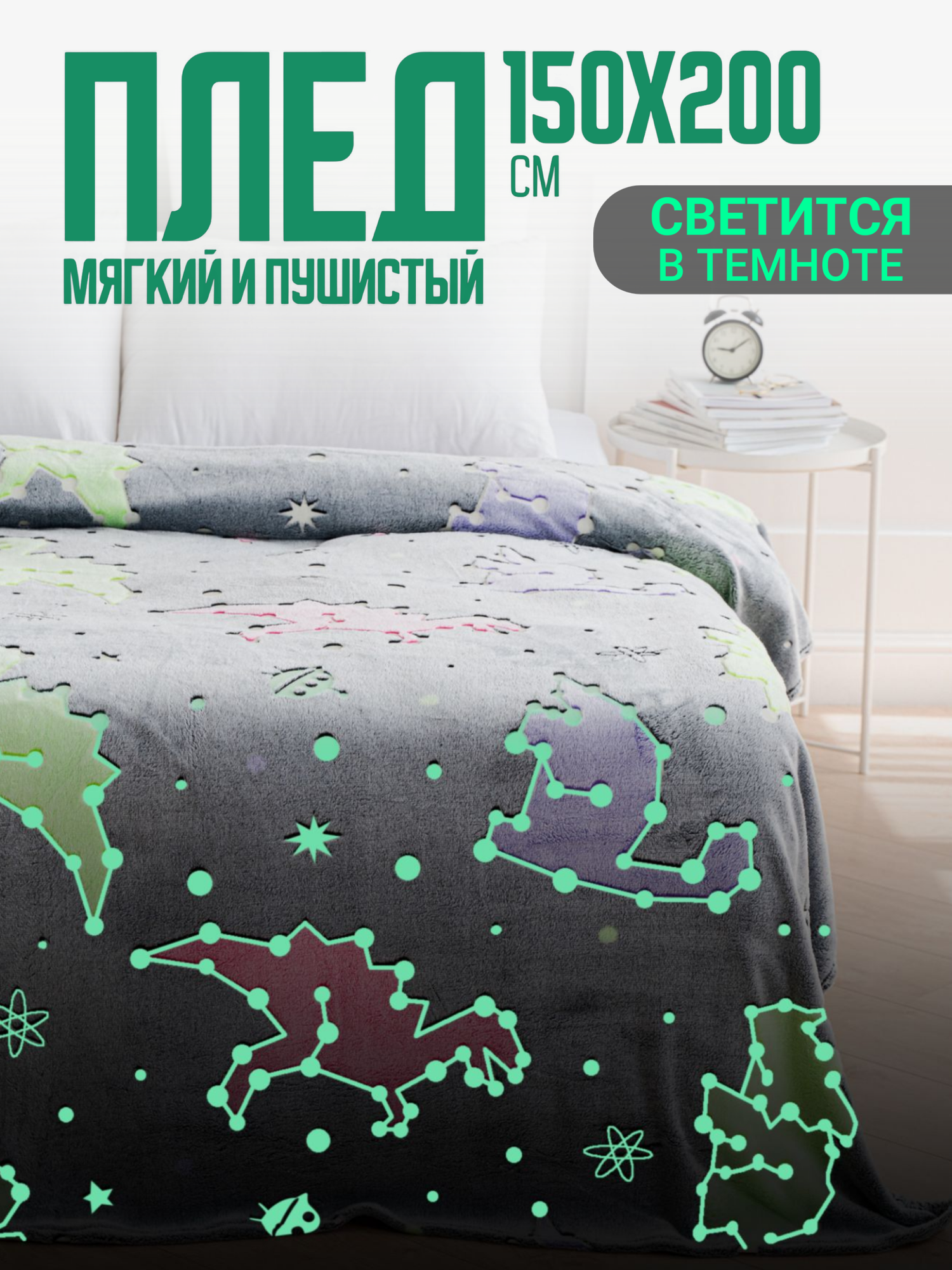 Плед 150х200 Павлина светящийся Звезды (светонакопитель), 1.5 спальный, полуторный, серый