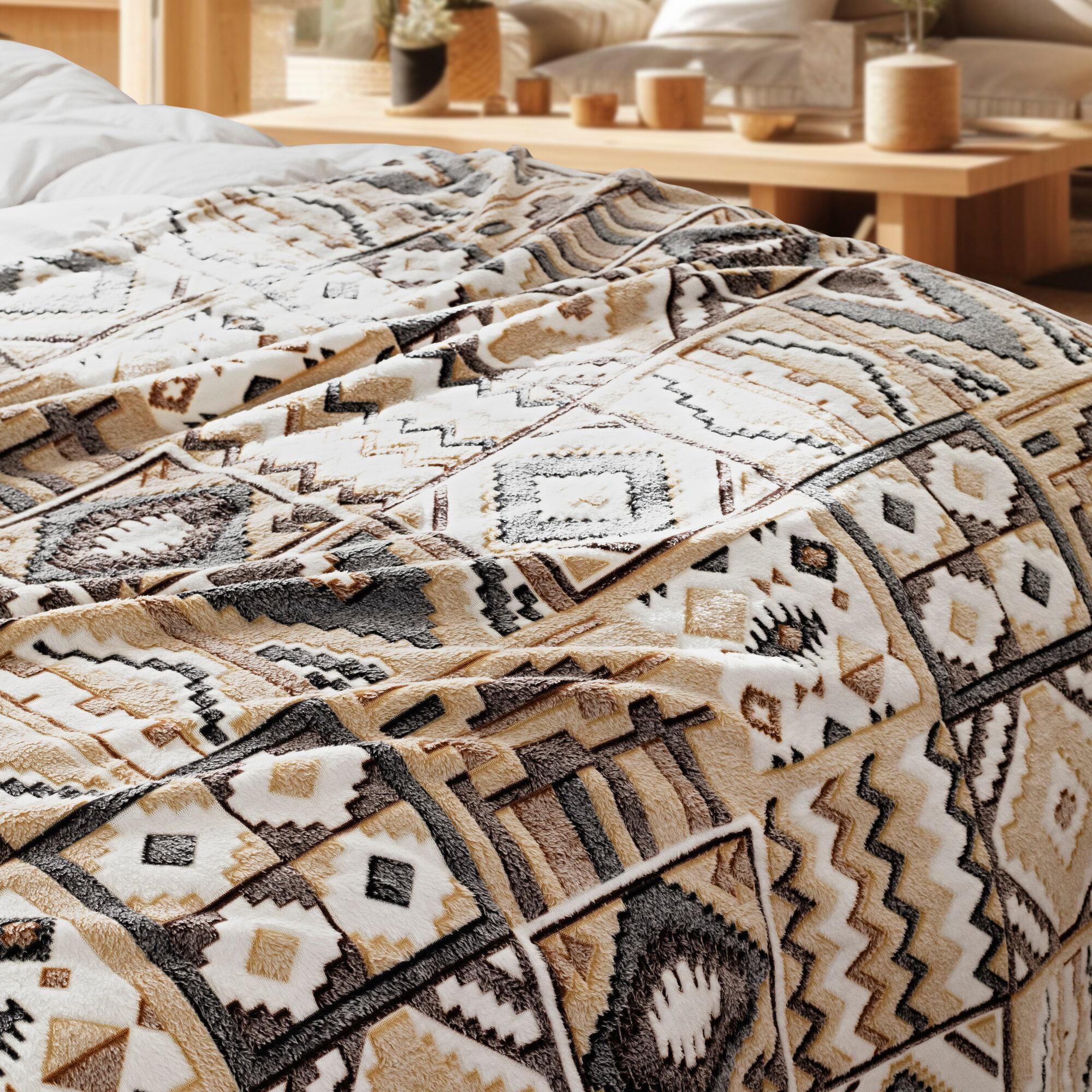 Плед двуспальный евро 200х220 песочный беж, покрывало на кровать и диван Cleo Parma, пушистый с рисунком, велсофт