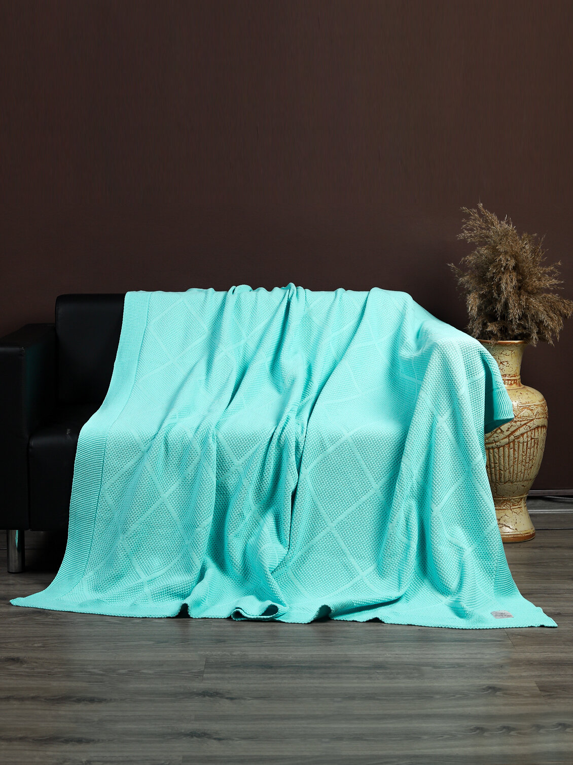 СохранитьПлед 180х220, вязаный, KING PLAID, бирюзовый, хлопок, покрывало на кровать, на диван, на кресло, в подарочной сумке интересное: