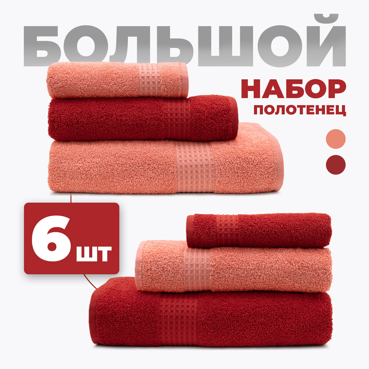 Купить Большой набор махровых полотенец для всей семьи Самур - 6 штук (2 больших, 2 средних, 2 маленьких) розовый, красный / хлопок / подарок