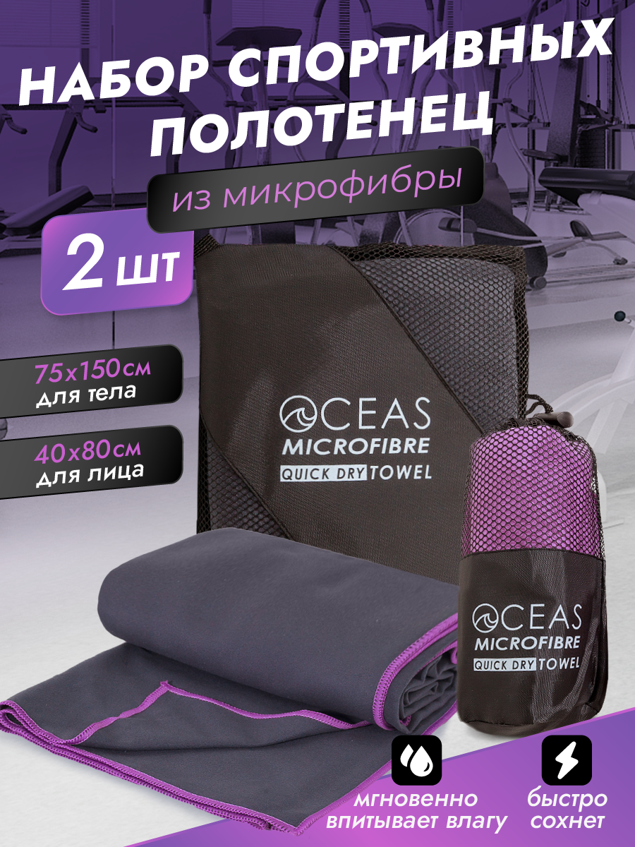 Набор спортивных полотенец OCEAS из микрофибры, быстросохнущее, 150х75 см, 40х80 см, серый, фиолетовый
