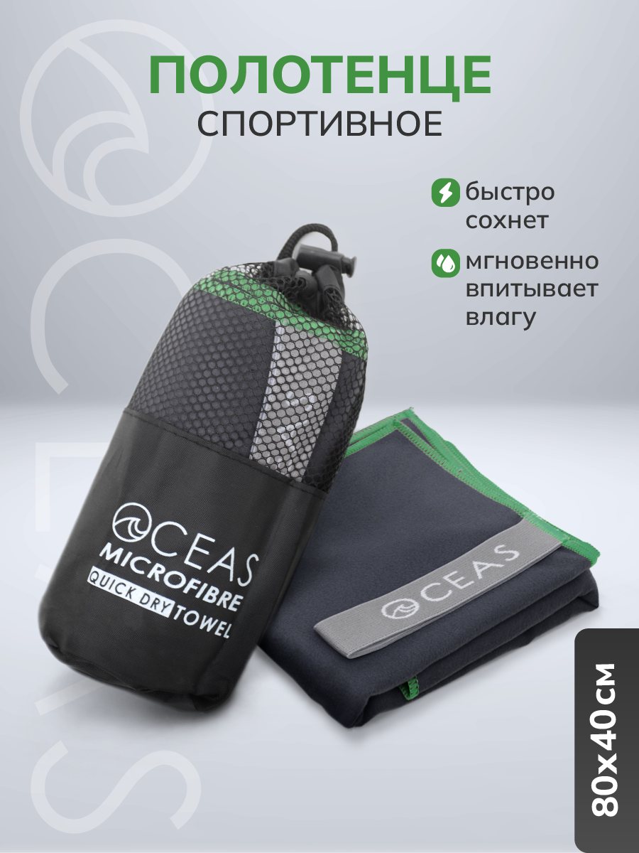 Полотенце спортивное OCEAS из микрофибры , быстросохнущее для фитнеса и йоги, 80х40 см, темно-серый с зеленой строчкой