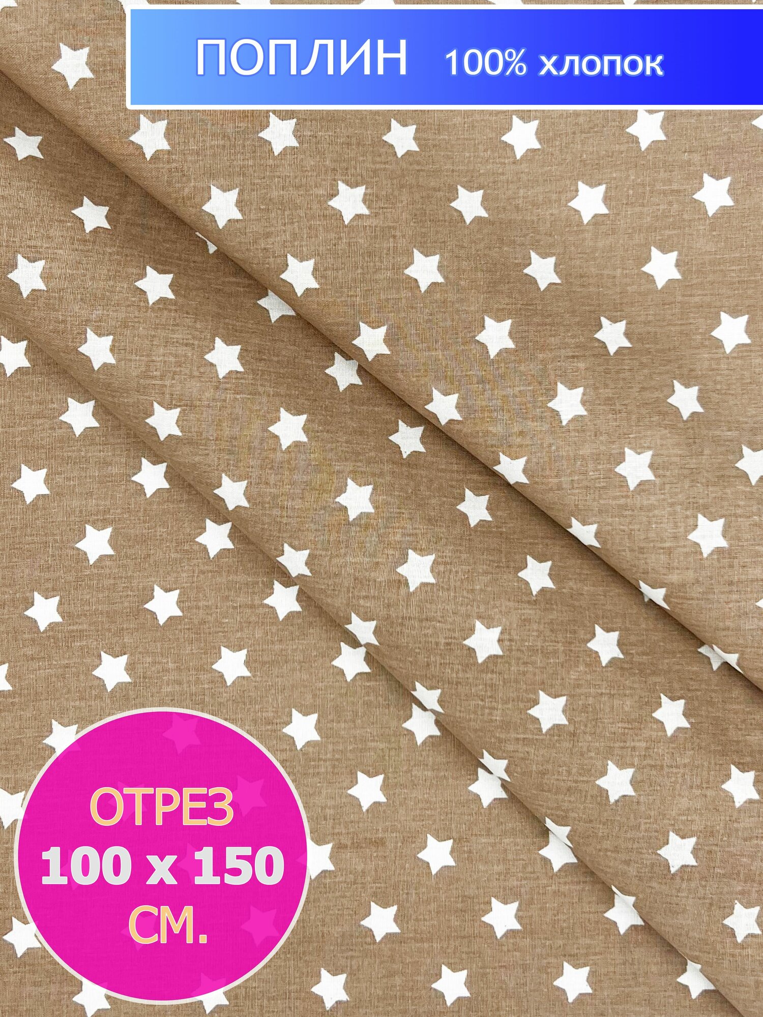 Ткань хлопковая Поплин, Коричневые Звезды на Белом, отрез 1х1,5 м