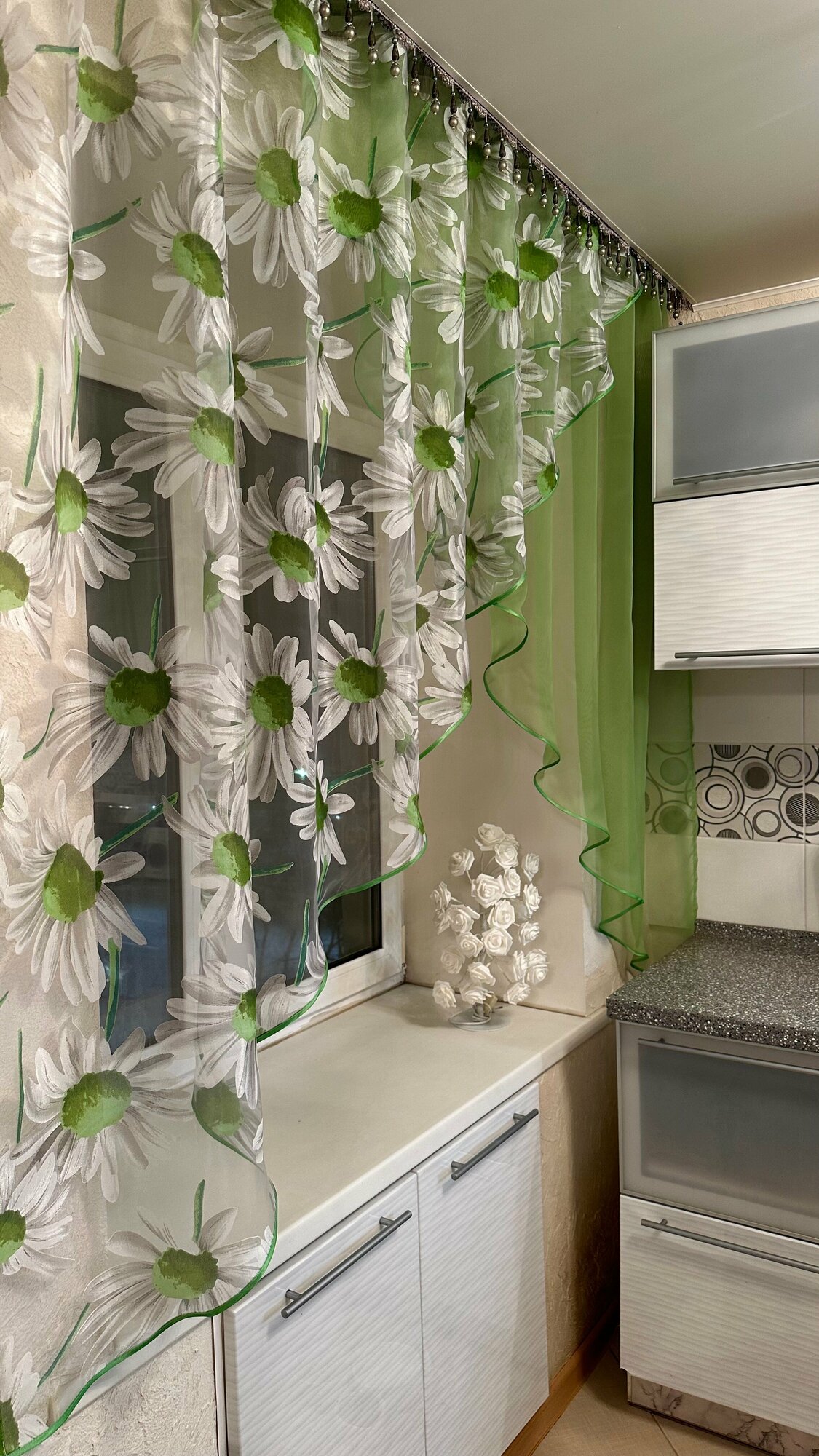 СохранитьКухонная шторка ромашка зеленая, ширина 3м, высота 1,7м интересное: