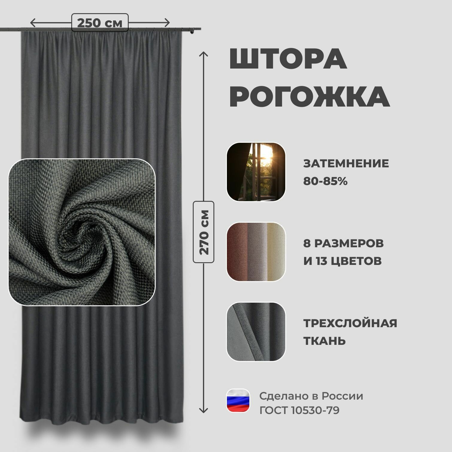 СохранитьШтора для комнаты 250x270 см Блэкаут рогожка Shtoraland на ленте для крючков, одна портьера для гостиной, спальни, детской. Темно-серый цвет (графит) интересное: