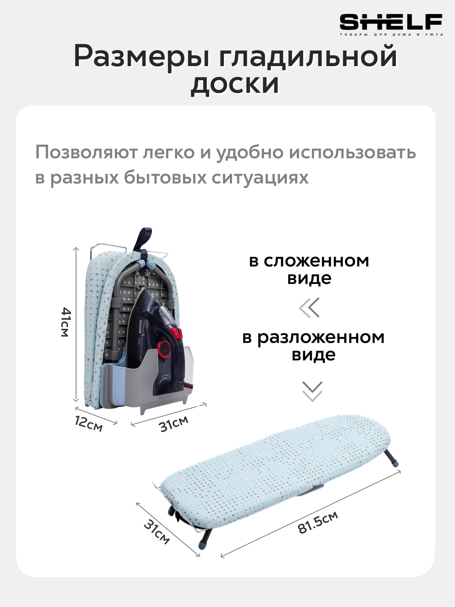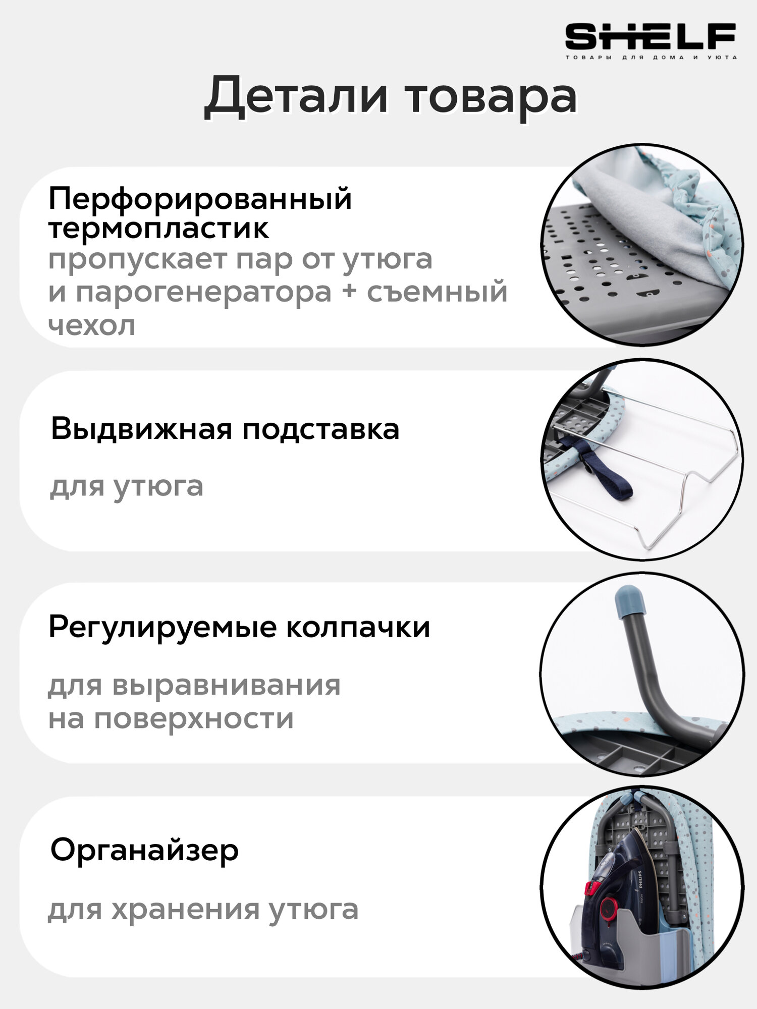 | Подробная комплектация | Настольная складная гладильная доска.чехол, держатель для утюга, органайзер для хранения утюга |