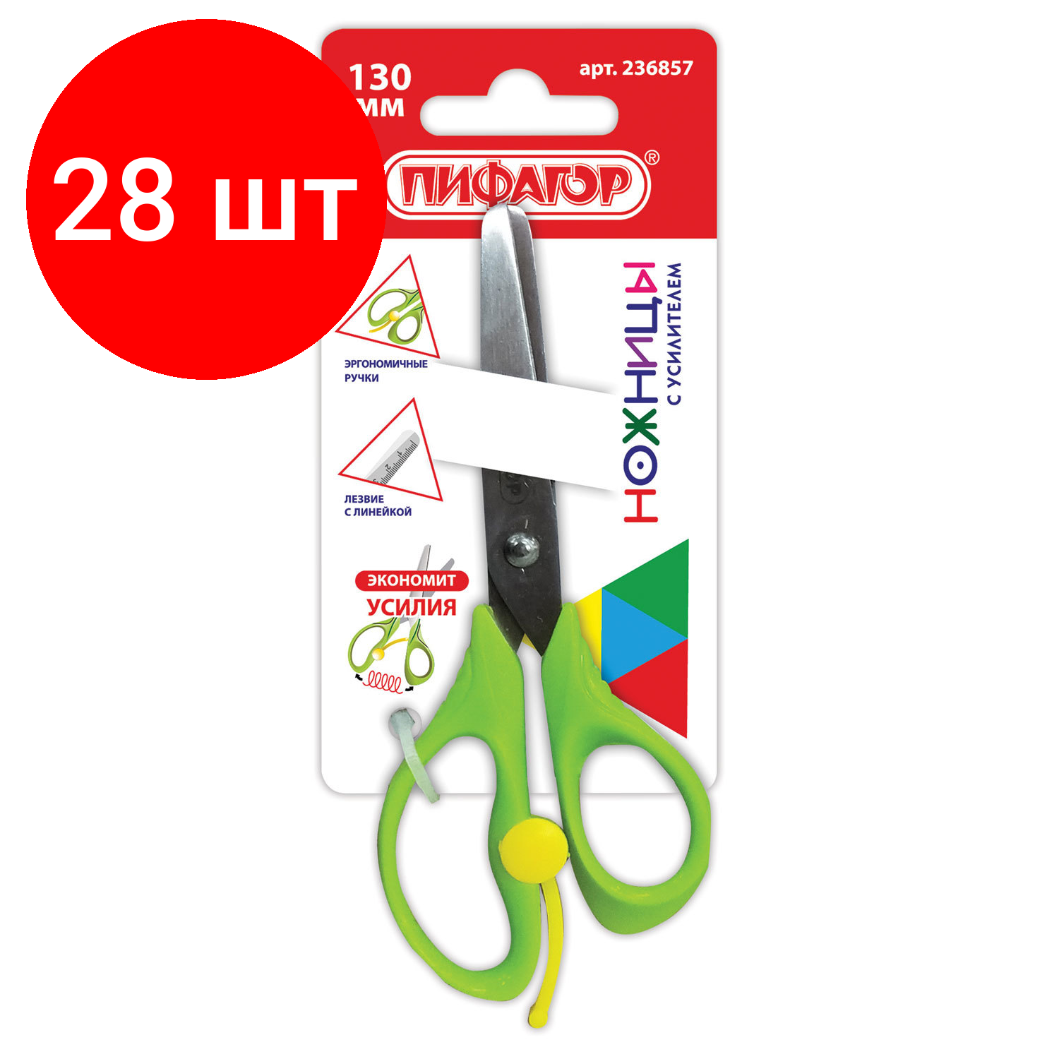 Купить Комплект 28 шт, Ножницы пифагор, 130 мм, с усилителем, линейкой, зеленые, в картонной упаковке с европодвесом, 236857