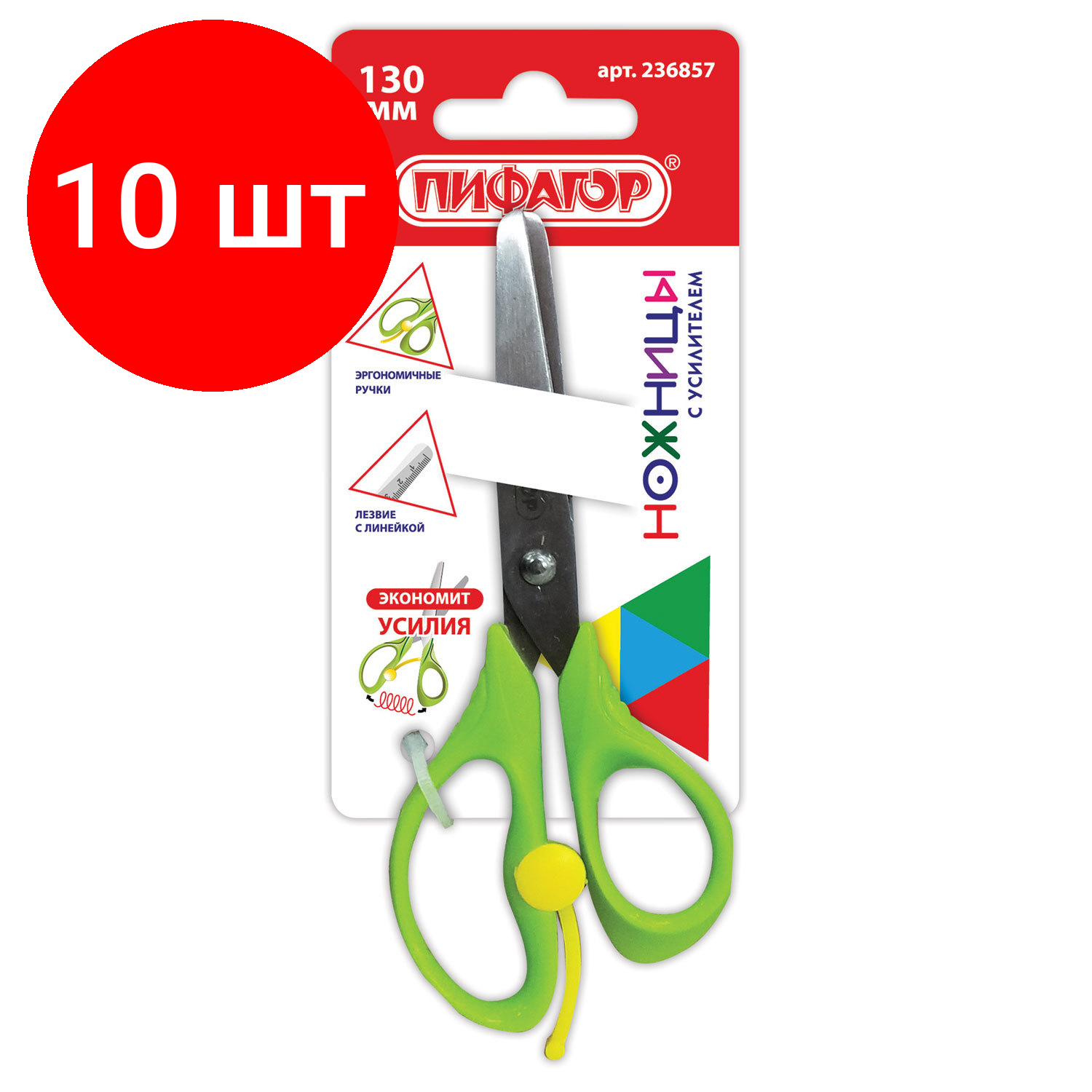 Купить Комплект 10 шт, Ножницы пифагор, 130 мм, с усилителем, линейкой, зеленые, в картонной упаковке с европодвесом, 236857