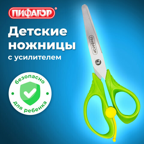 Ножницы канцелярские детские для детей для бумаги и картона в школу Пифагор, 130 мм, с усилителем, линейкой, зеленые , 236857