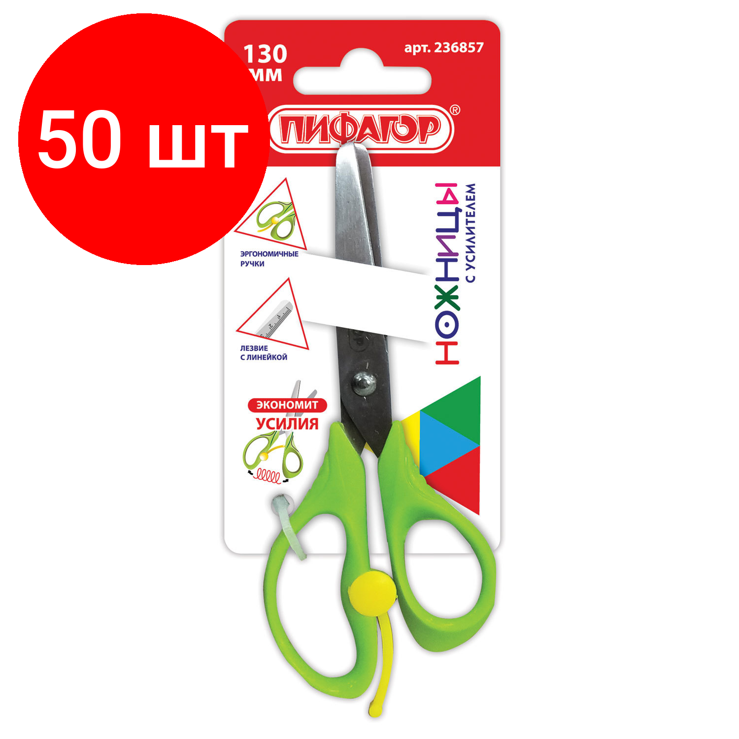 Купить Комплект 50 шт, Ножницы пифагор, 130 мм, с усилителем, линейкой, зеленые, в картонной упаковке с европодвесом, 236857