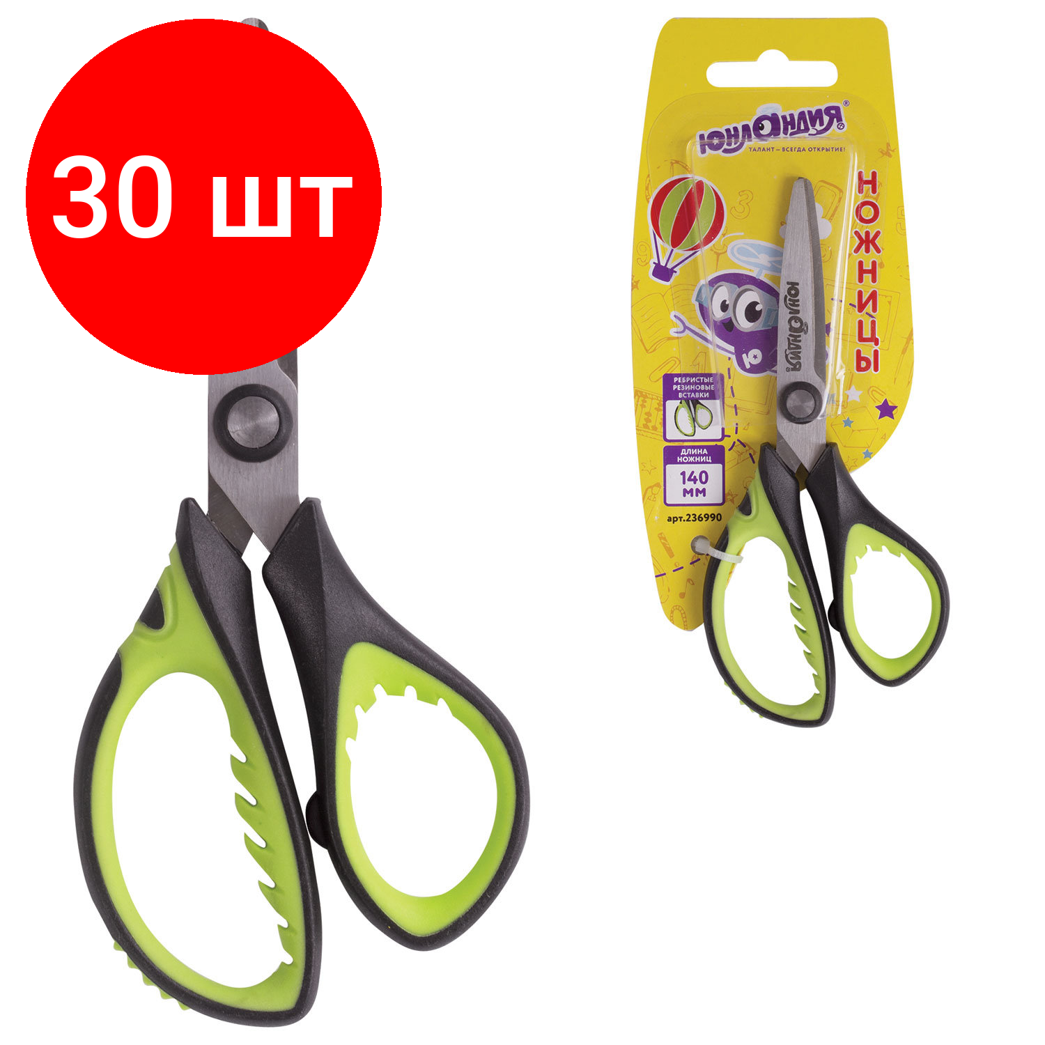 СохранитьКомплект 30 шт, Ножницы юнландия "BASIC", 140 мм, ребристые резиновые вставки, черно-салатовые, европодвес, 236990 интересное:
