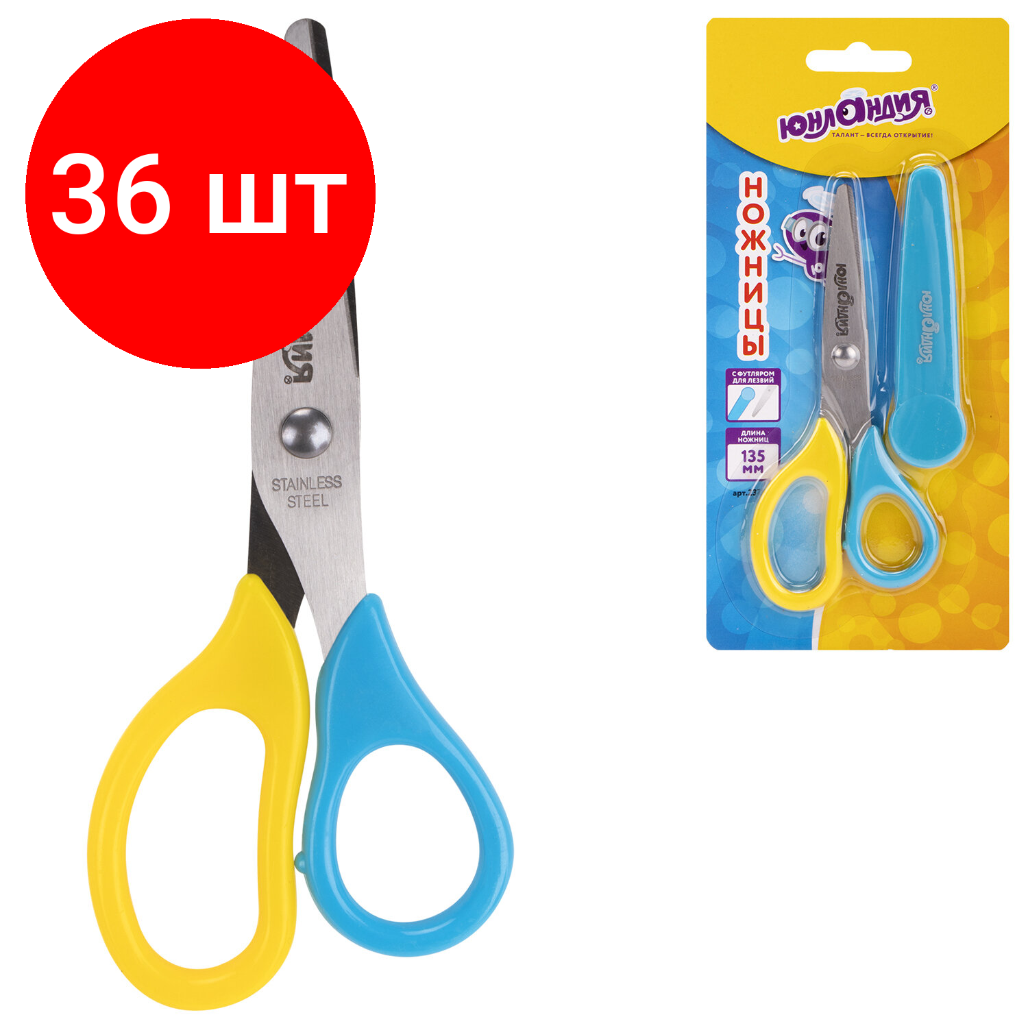 Купить Комплект 36 шт, Ножницы юнландия, 135 мм, с футляром для лезвий, желто-голубые, блистер, 237110