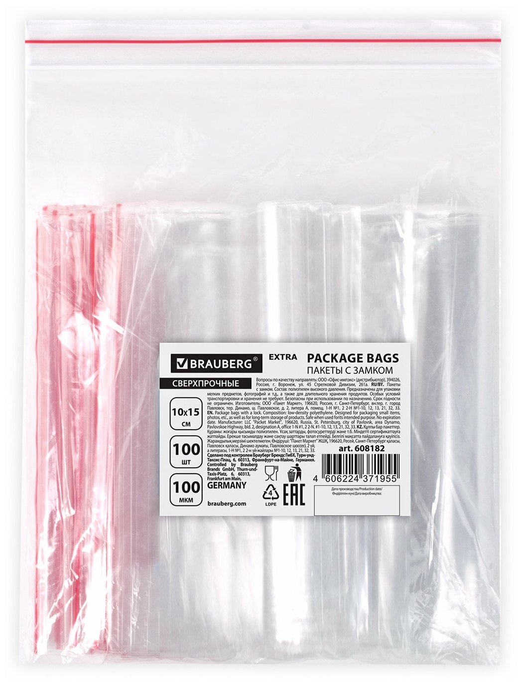 Пакеты с замком Brauberg "зиплок" сверхпрочные, 100 шт, 10х15 см, ПВД, 100 мкм, Extra