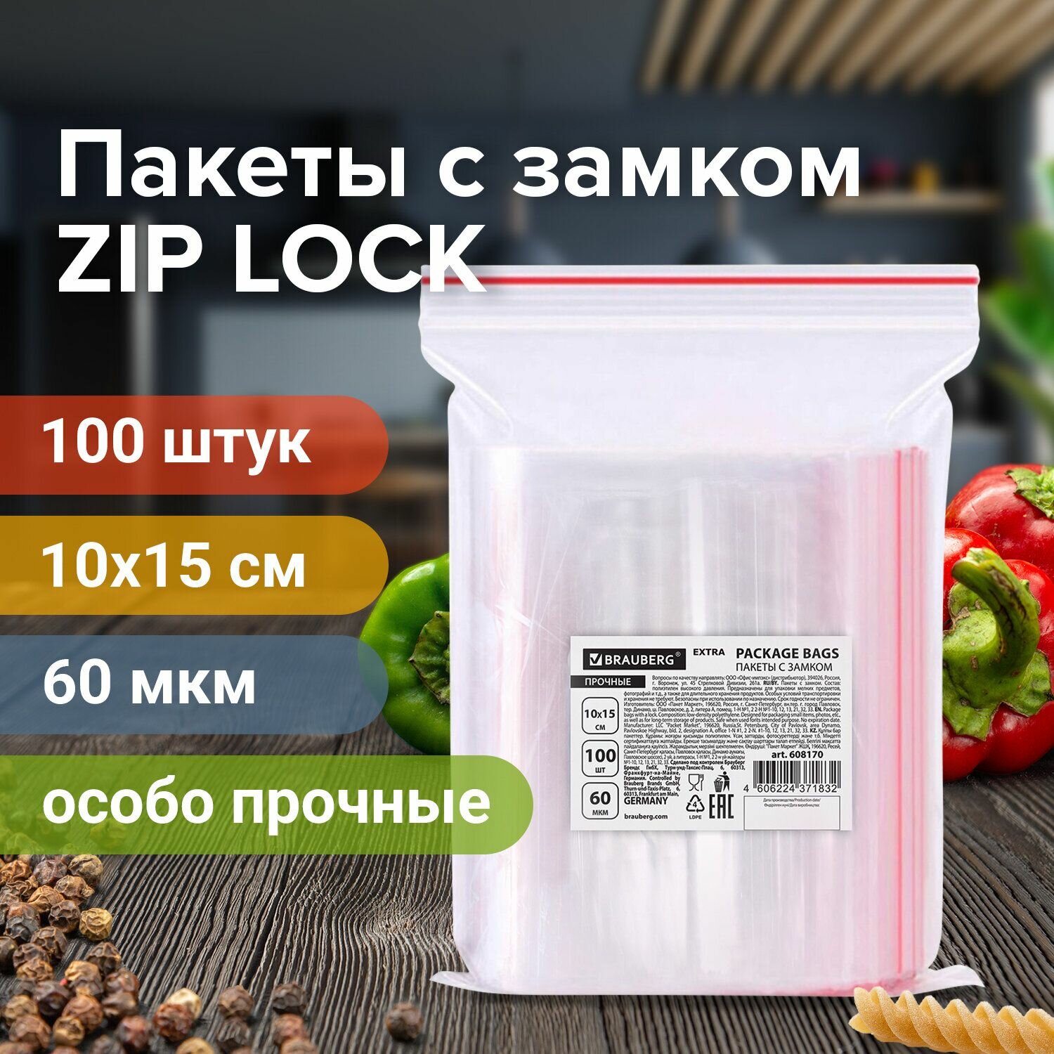 Пакеты Brauberg ZIP LOCK "зиплок" прочные, комплект 100 шт, 15х20 см, ПВД, 60 мкм, EXTRA, 608172