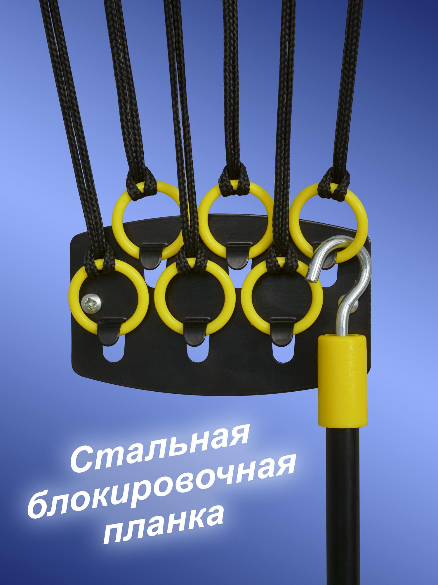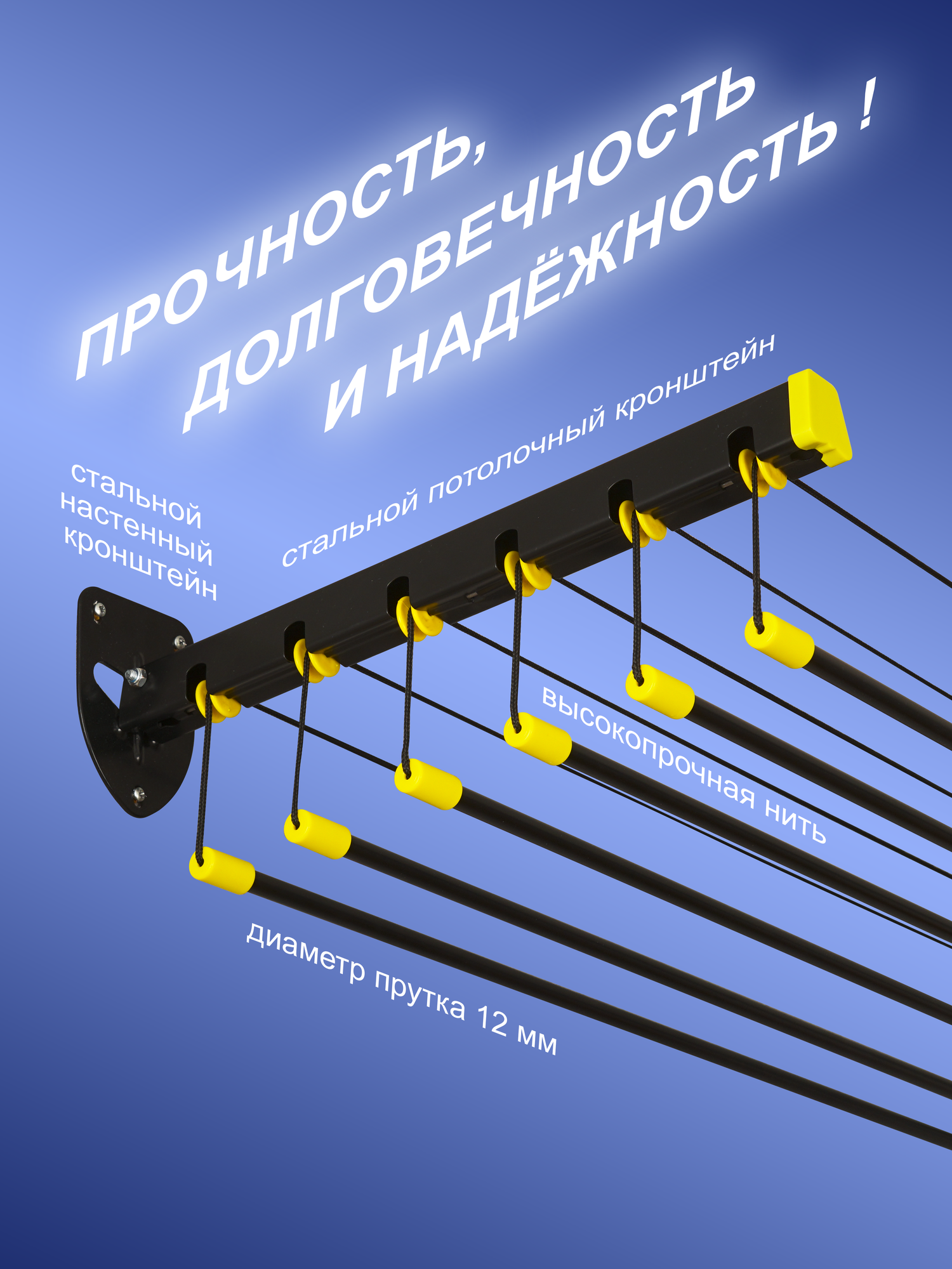 | Комплектация | - 6 стальных стержней в полимерной оболочке с наконечниками, диаметром 12 мм; - 2 металлических кронштейна с роликами для крепления к потолку, длиной 44 см; - 2 металлических кронштейна для крепления к стене; - металлическая блокировочная планка, длиной 10 см; - 6 фиксирующих колец; - палка-крючок; - устойчивый к истиранию полиамидный шнур, продетый в стержни; Крепеж: - 10 дюбелей; - 10 саморезов. |