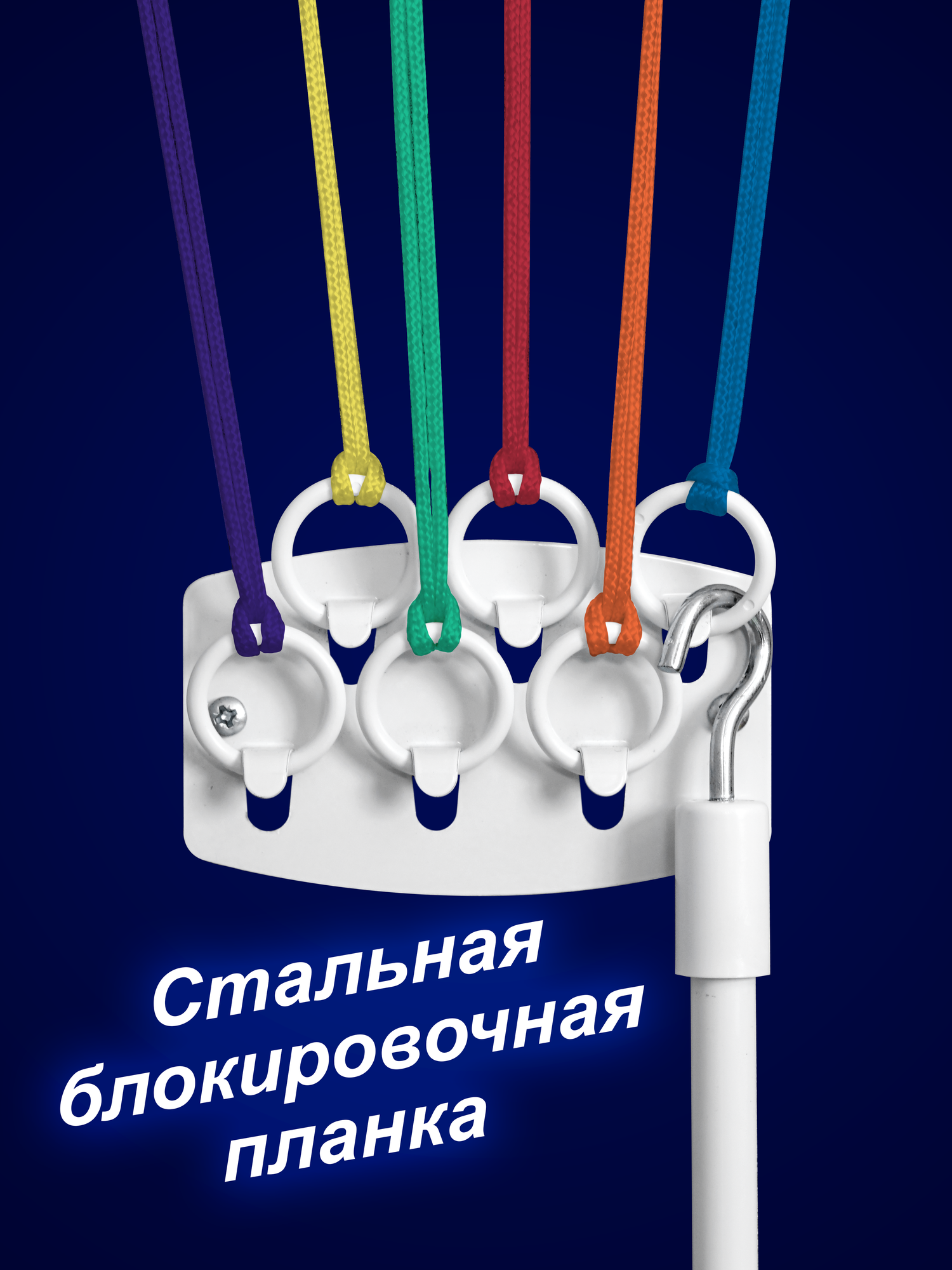 | Комплектация | - 6 стальных стержней в полимерной оболочке с наконечниками, диаметром 12 мм; - 2 металлических кронштейна с роликами для крепления к потолку, длиной 44 см; - 2 металлических кронштейна для крепления к стене; - металлическая блокировочная планка, длиной 10 см; - 6 фиксирующих колец; - палка-крючок; - устойчивый к истиранию полиамидный шнур, продетый в стержни; Крепеж: - 10 дюбелей; - 10 саморезов. |