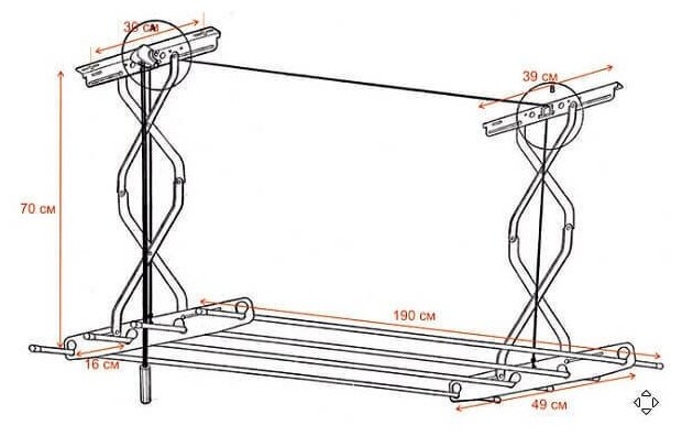 | Комплектация | Потолочная сушилка-1 шт.; Прутья-4 шт.; Саморезы-4 шт.; Шайбы-4 шт.; Верёвка для регулировки-1 шт. |