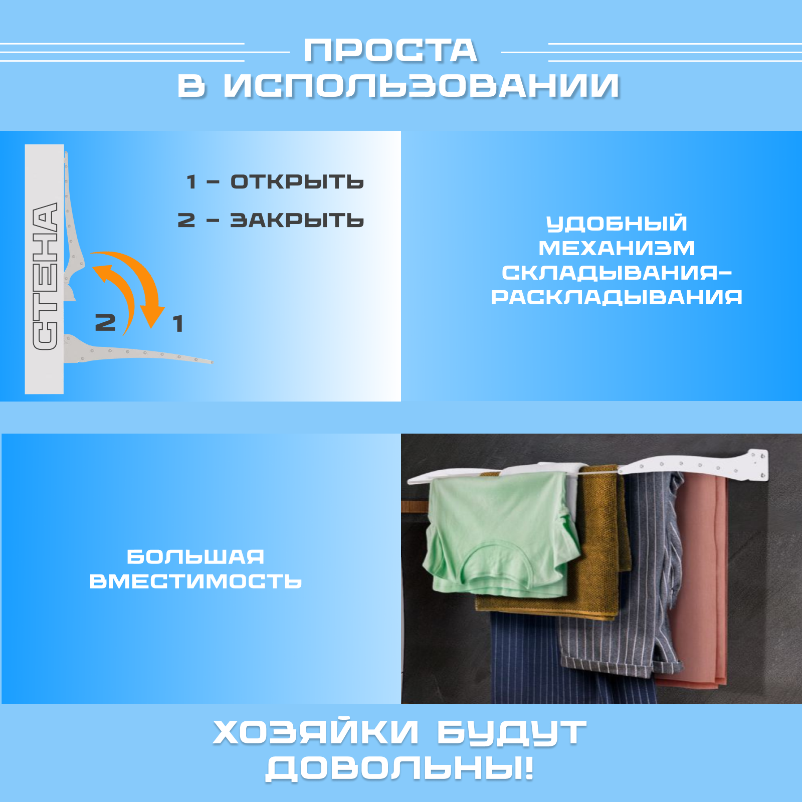 | Комплектация | Складная настенная сушилка для белья, инструкция по установке, саморезы и дюбеля к ним. |