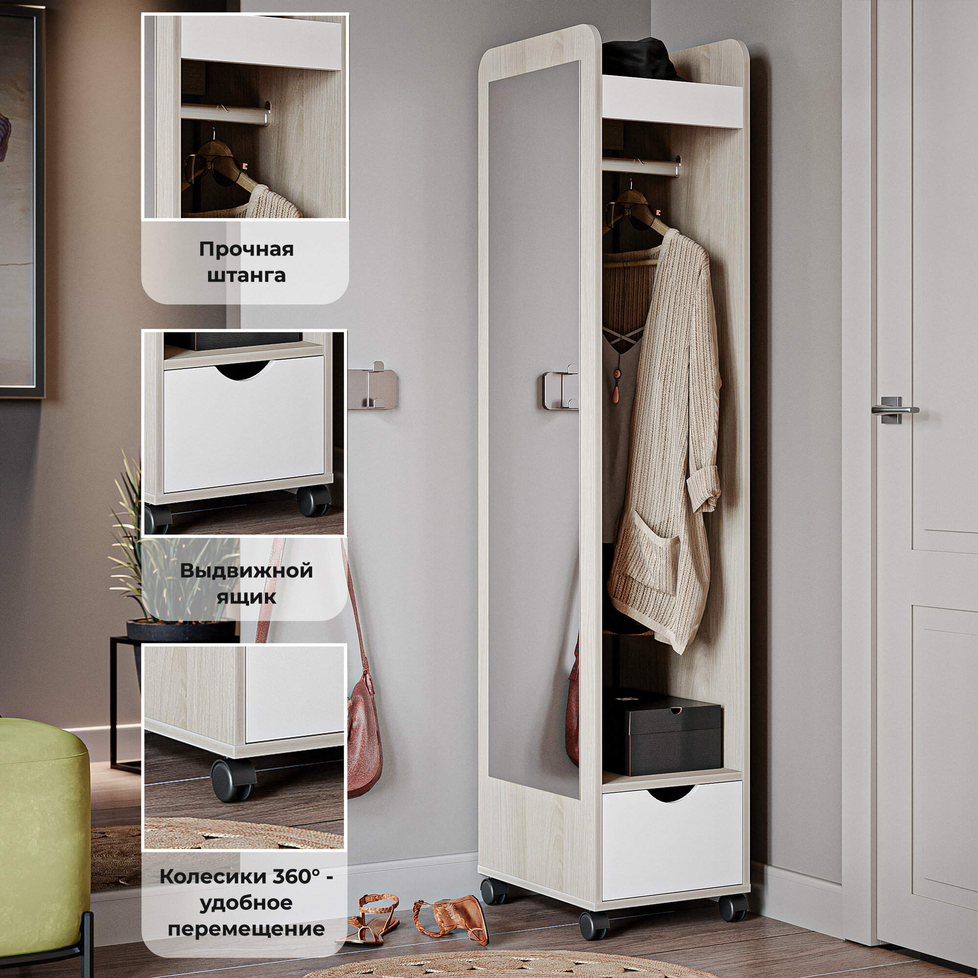 Вешалка в прихожую ТриЯ Лайт, со штангой, ящиком, зеркалом, 36x46х173 см