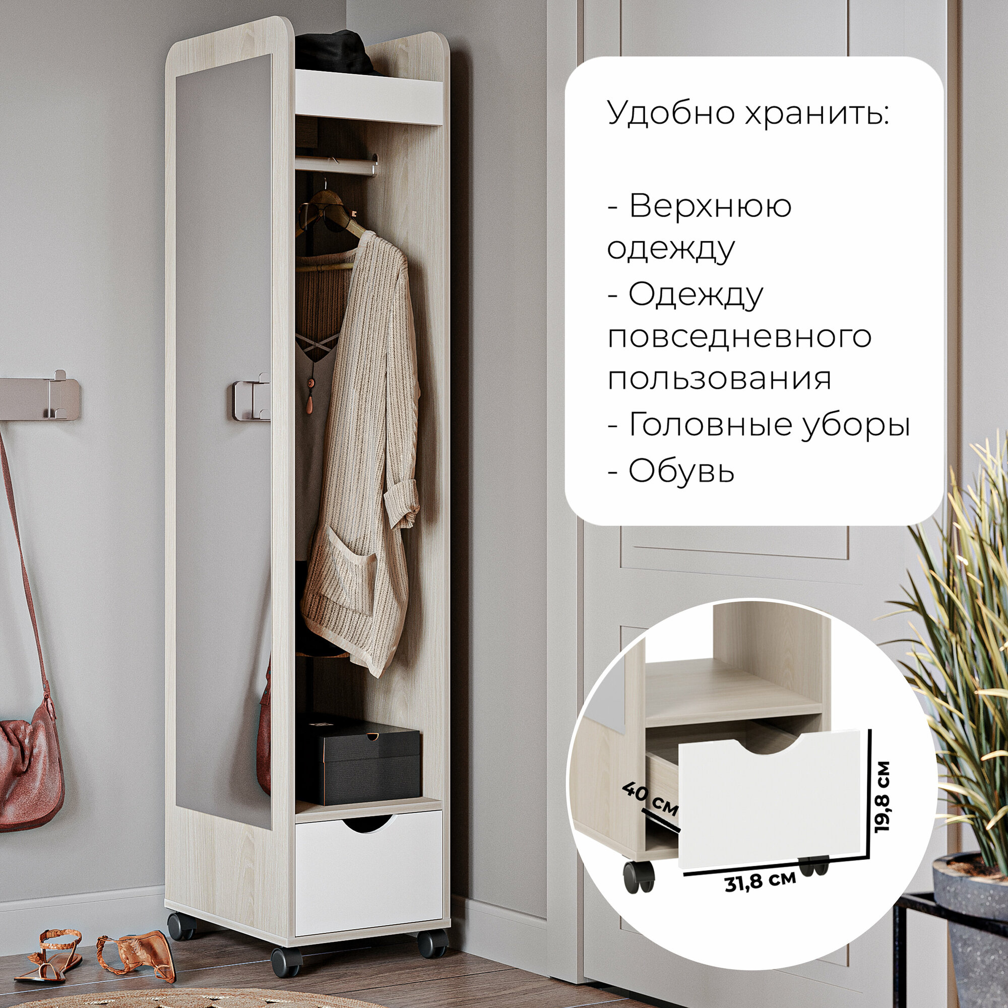 Прихожая мебель бежевый белый с зеркалом и ящиком (ВхШхГ) 173х36х46 см, Лайт секция интересное: