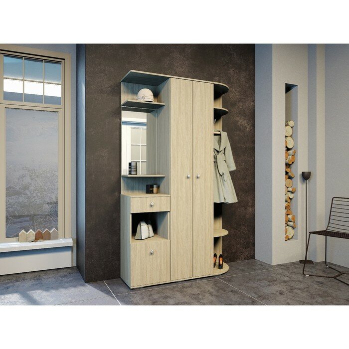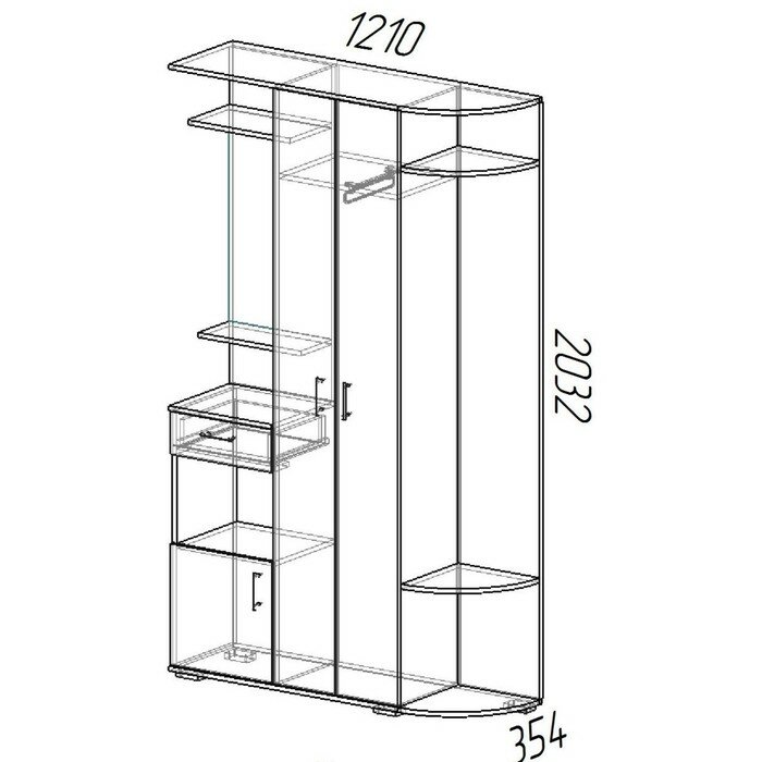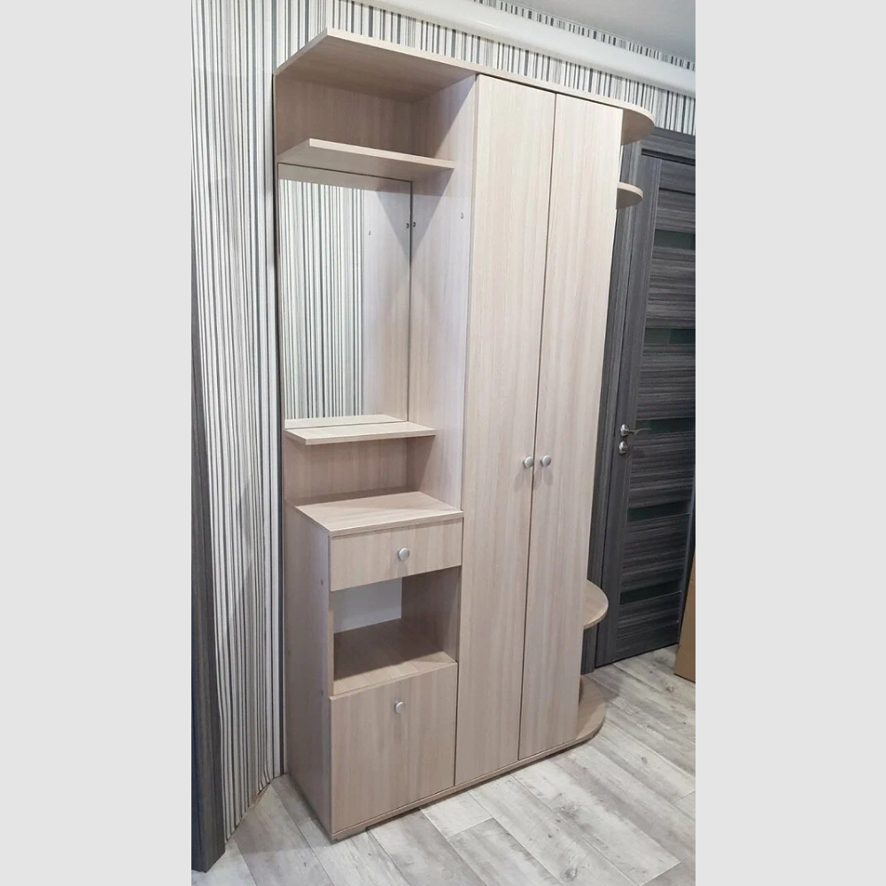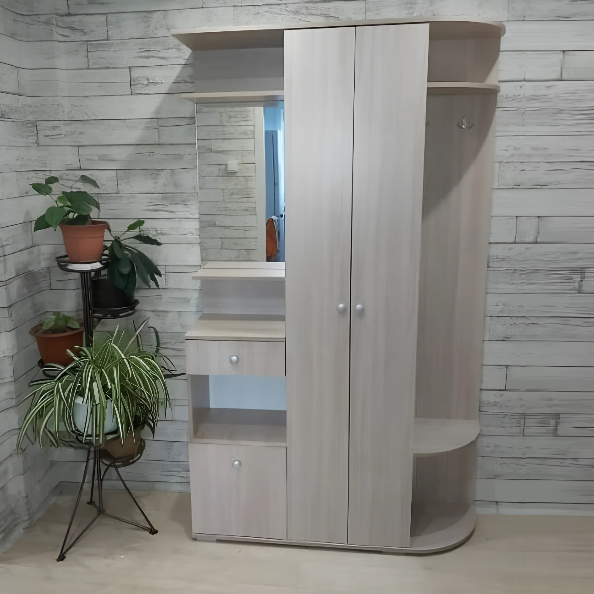 | Состав комплекта | шкаф с выдвижной штангой и с антресольной полкой; выдвижной ящик; вешалка с крючками для одежды; внизу ниша за распашной дверцей; зеркало |