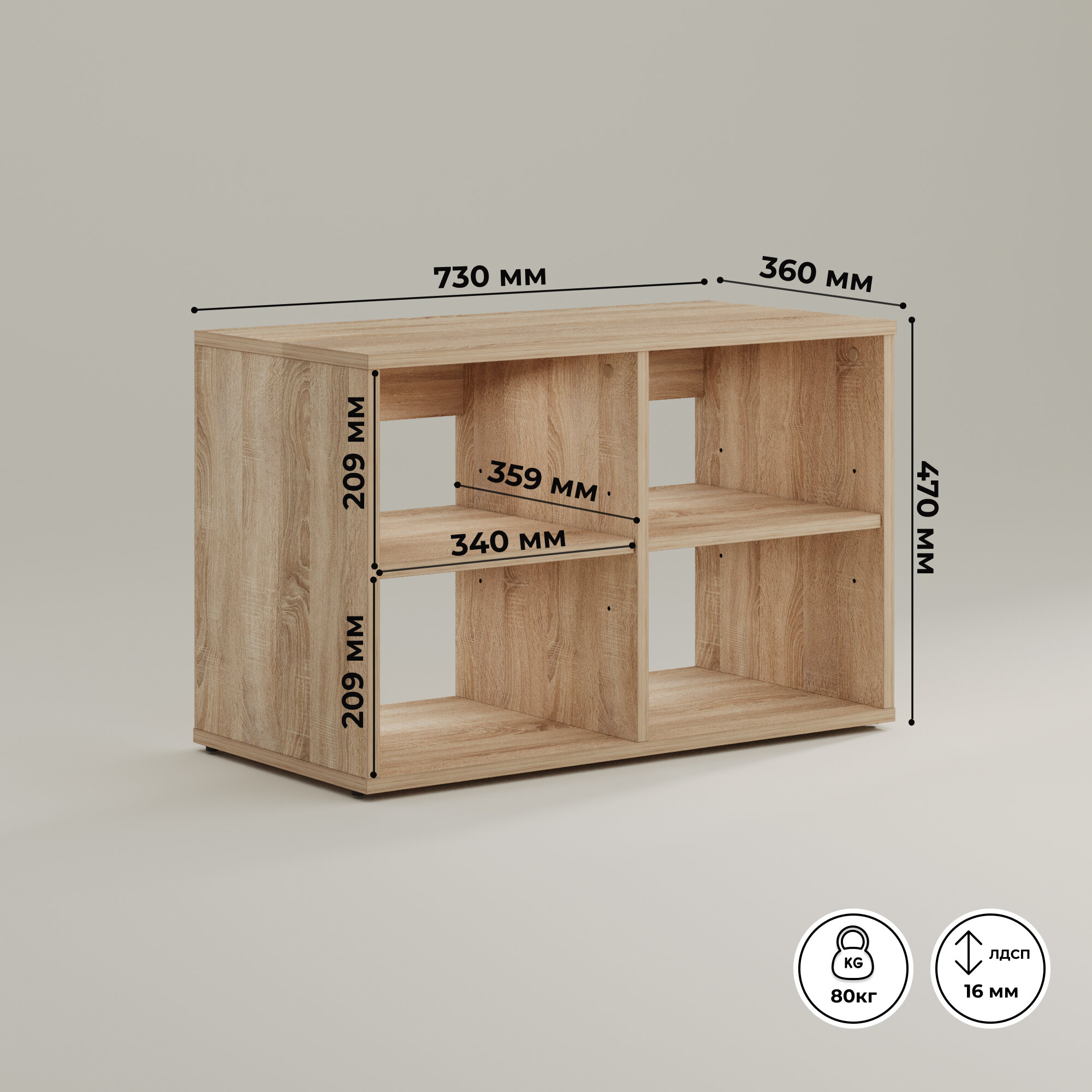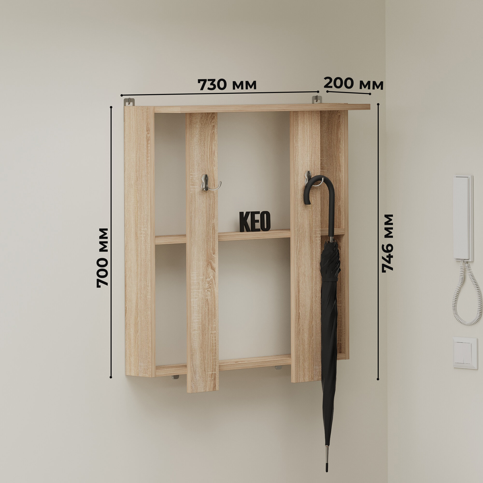 | Габариты | Размер вешалки с полками 730 х 698 х 16 мм; Допустимая нагрузка на каждый крючок до 7 кг, на каждую скрытую полочку до 5 кг; Размер тумбы-обувницы 730 х 470 х 360 мм; Допустимая нагрузка на верхнюю часть обувницы до 40 кг, на полки до 7 кг. |