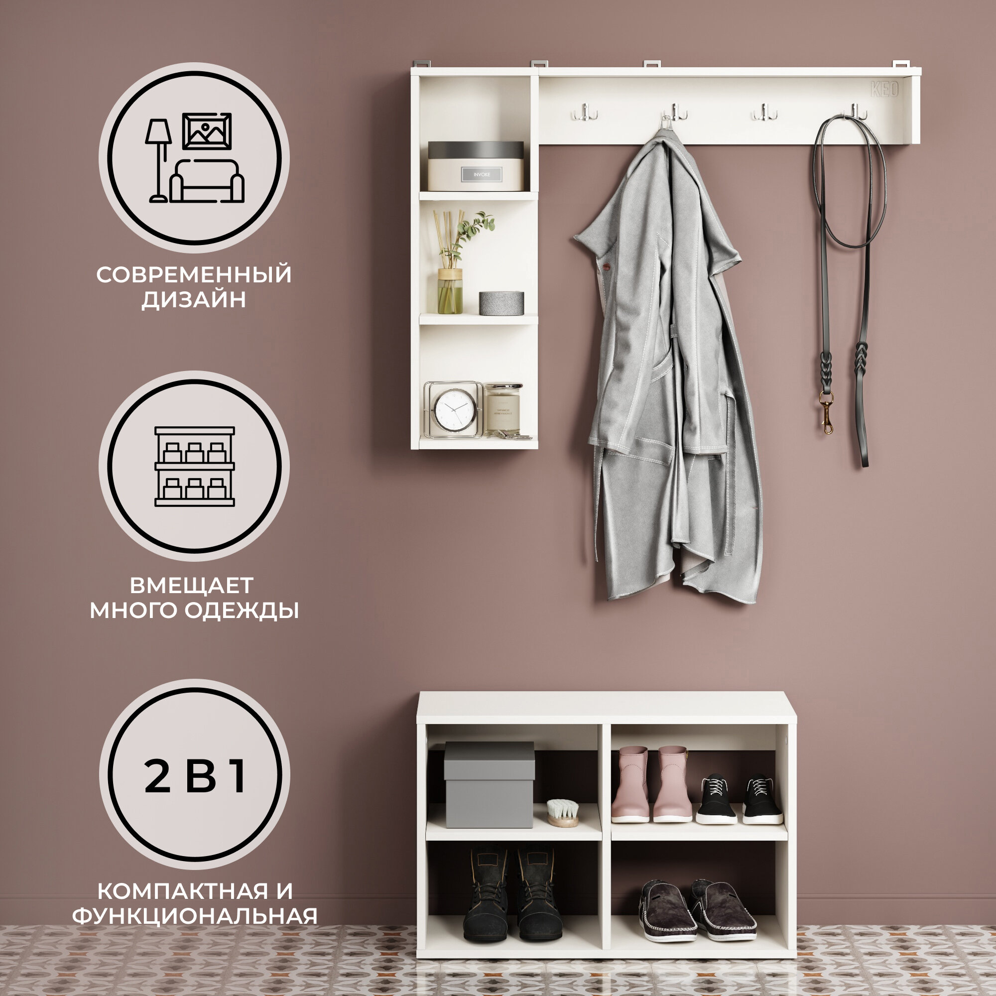 Комплект мебели вешалка + тумба для обуви, молочный белый цвет, Кео ПРХ-415