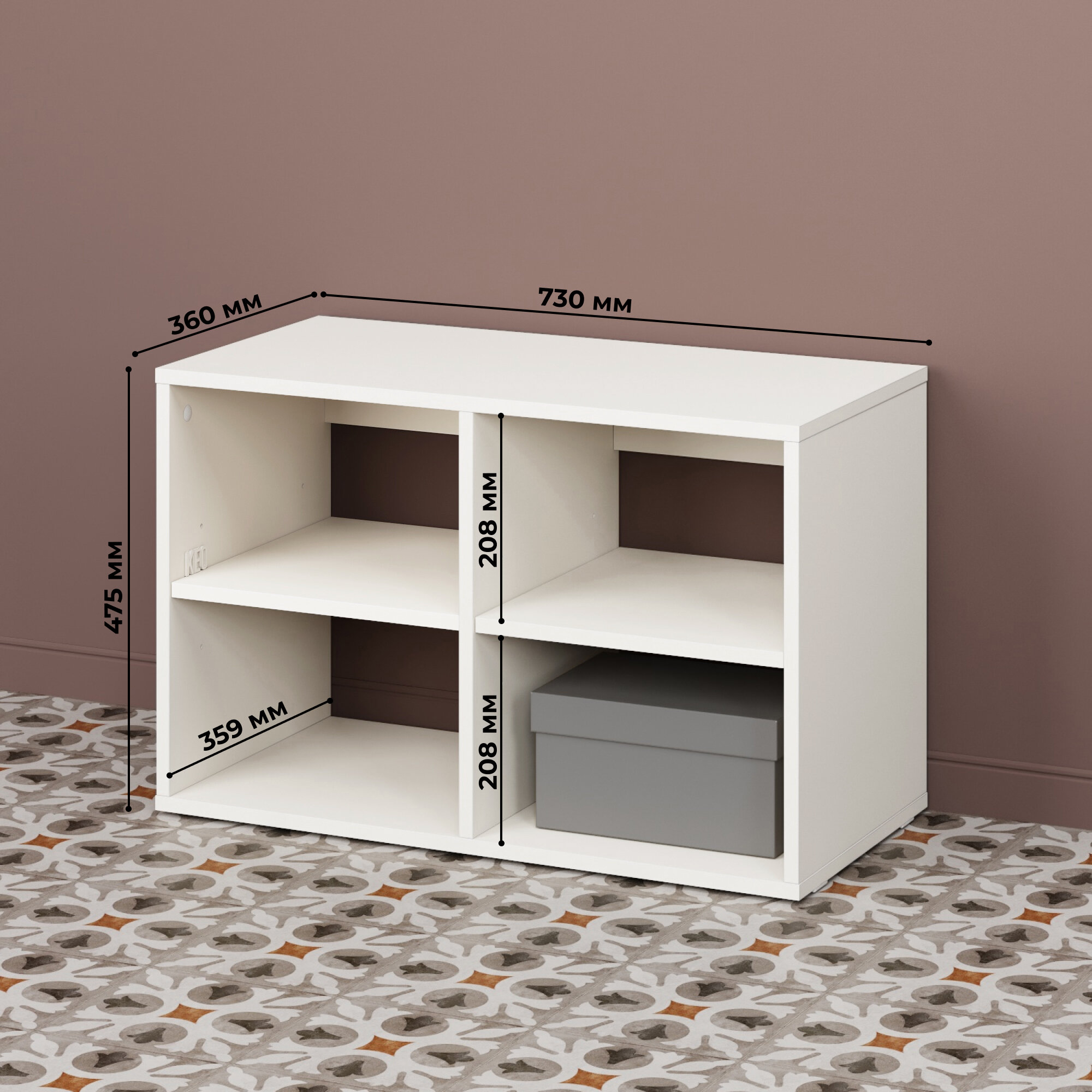 | Габариты | Размер вешалки с полками 730 х 698 х 16 мм; Допустимая нагрузка на каждый крючок до 7 кг, на каждую скрытую полочку до 5 кг; Размер тумбы-обувницы 730 х 470 х 360 мм; Допустимая нагрузка на верхнюю часть обувницы до 40 кг, на полки до 7 кг. |