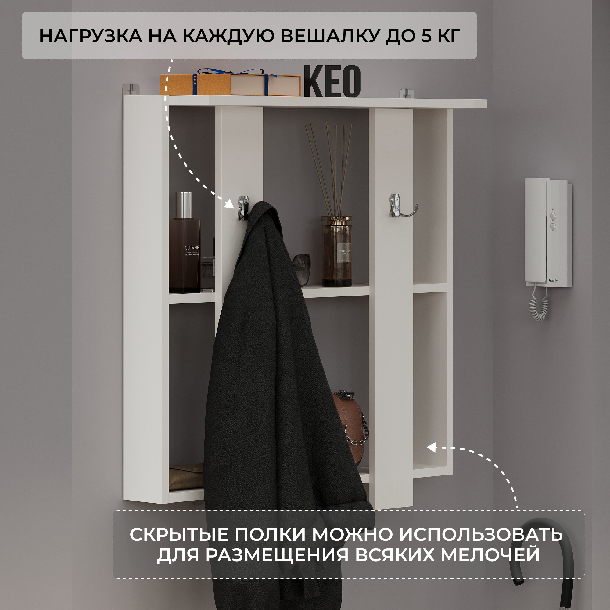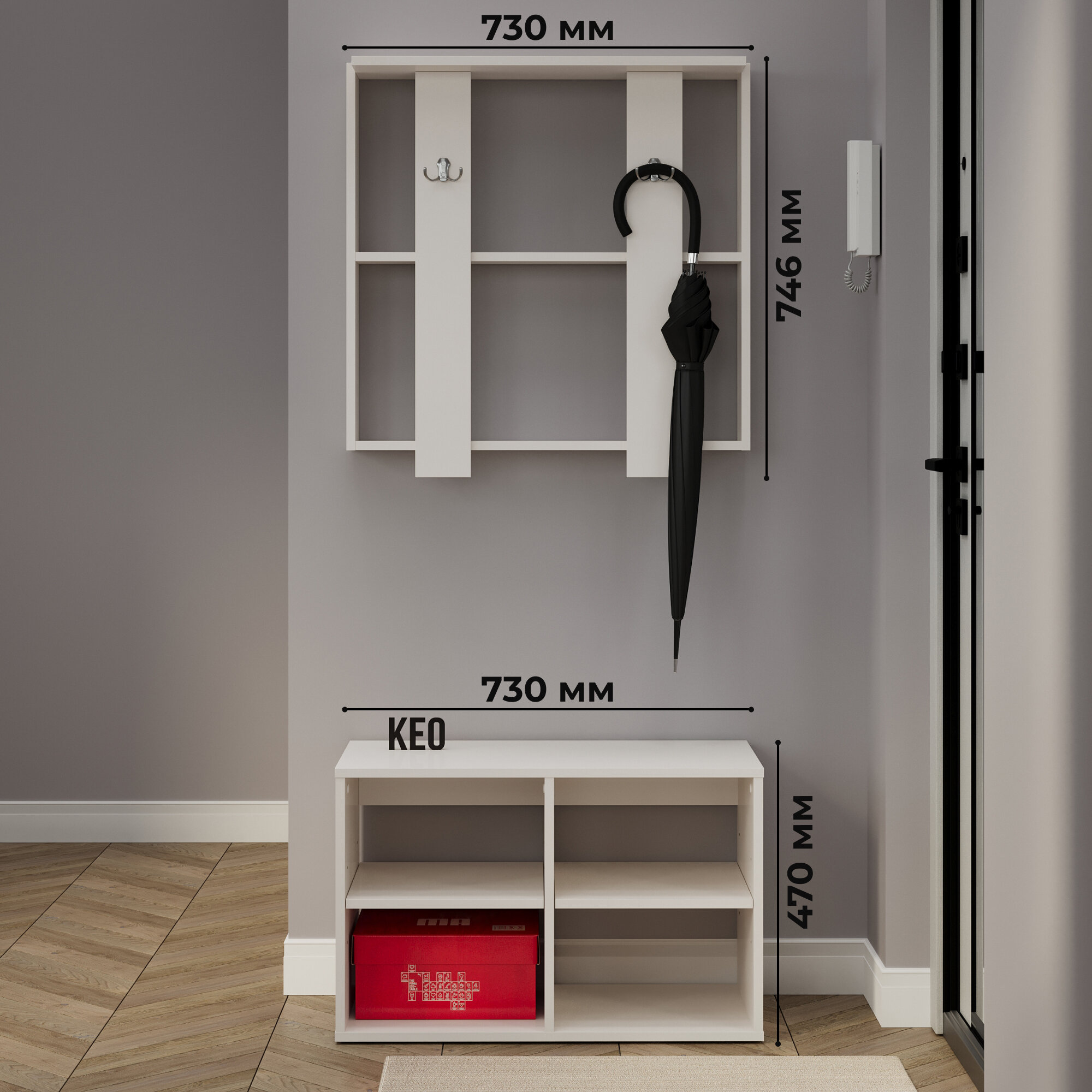 | Габариты | Размер вешалки с полками 730 х 698 х 16 мм; Допустимая нагрузка на каждый крючок до 7 кг, на каждую скрытую полочку до 5 кг; Размер тумбы-обувницы 730 х 470 х 360 мм; Допустимая нагрузка на верхнюю часть обувницы до 40 кг, на полки до 7 кг. |