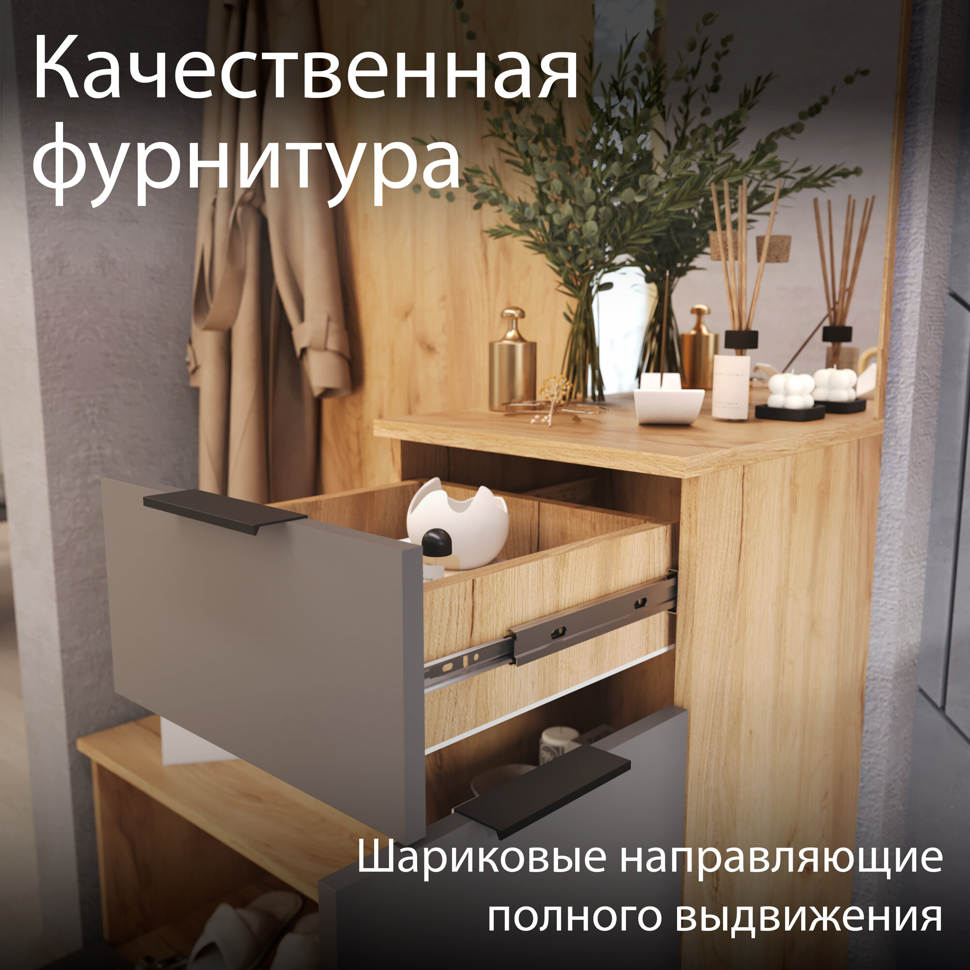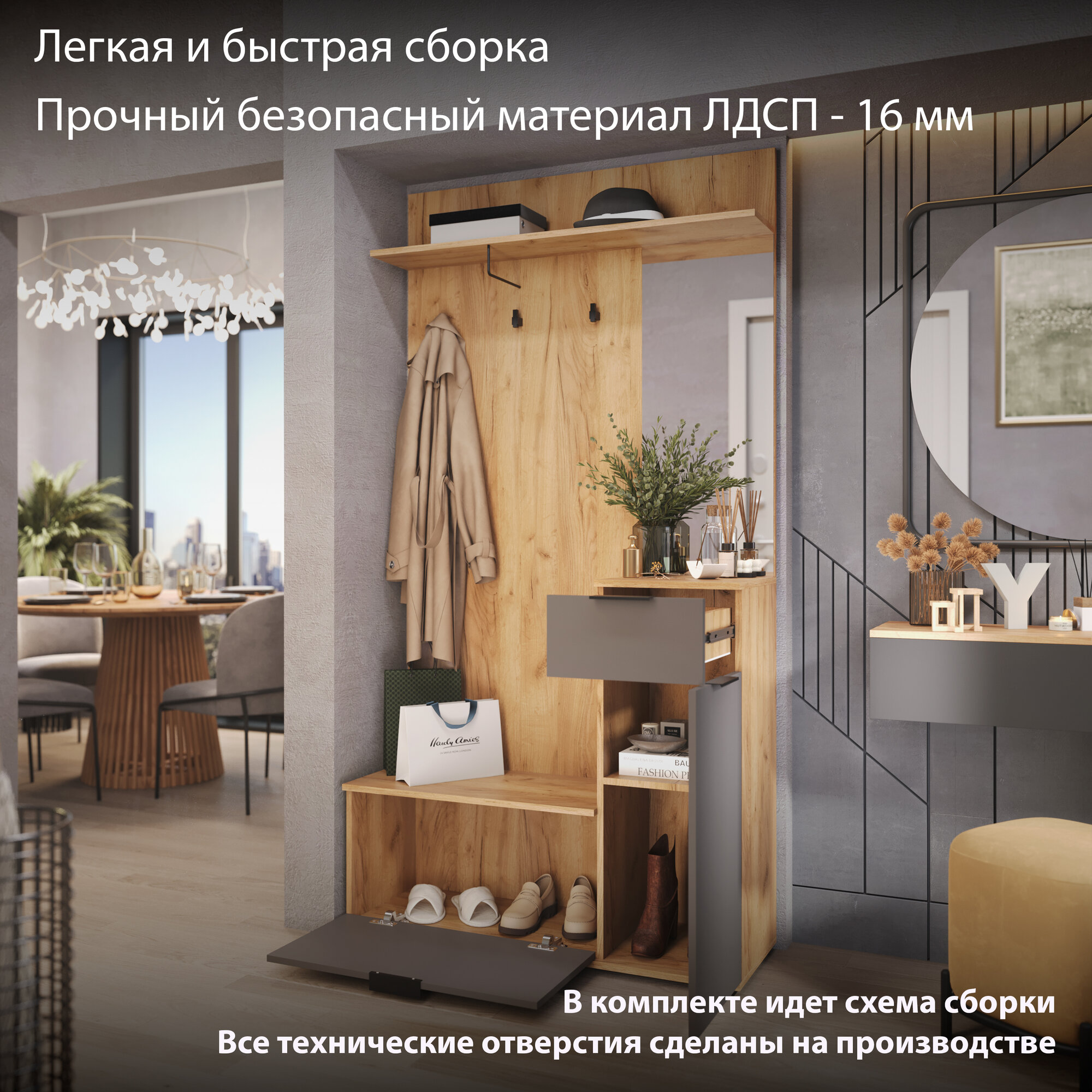 Прихожая в коридор с зеркалом и ящиками, шкаф в коридор, золотой дуб, серый Эвита Тип 1 интересное:
