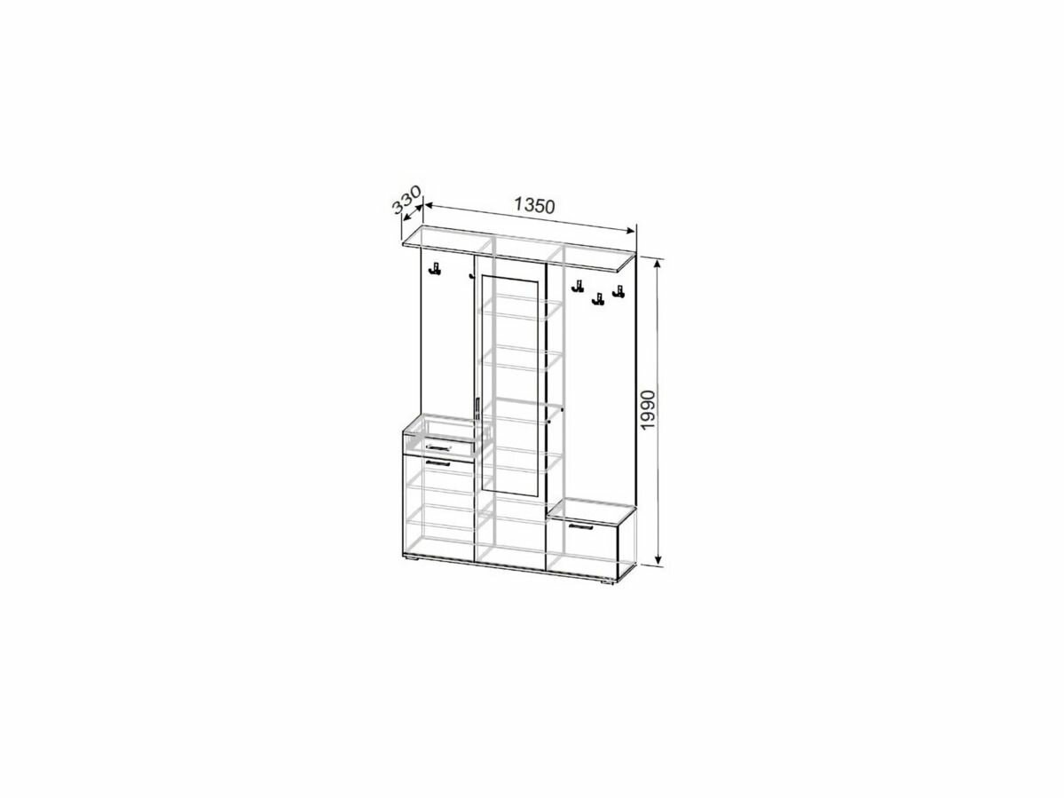 | Габариты | тумба ШхВ: 45х78,6 см; высота щита слева 116,8 см; ширина пенала 45 см; зеркало 135х35 см; обувница ШхВ: 45х37 см; высота щита справа: 158,4 см |