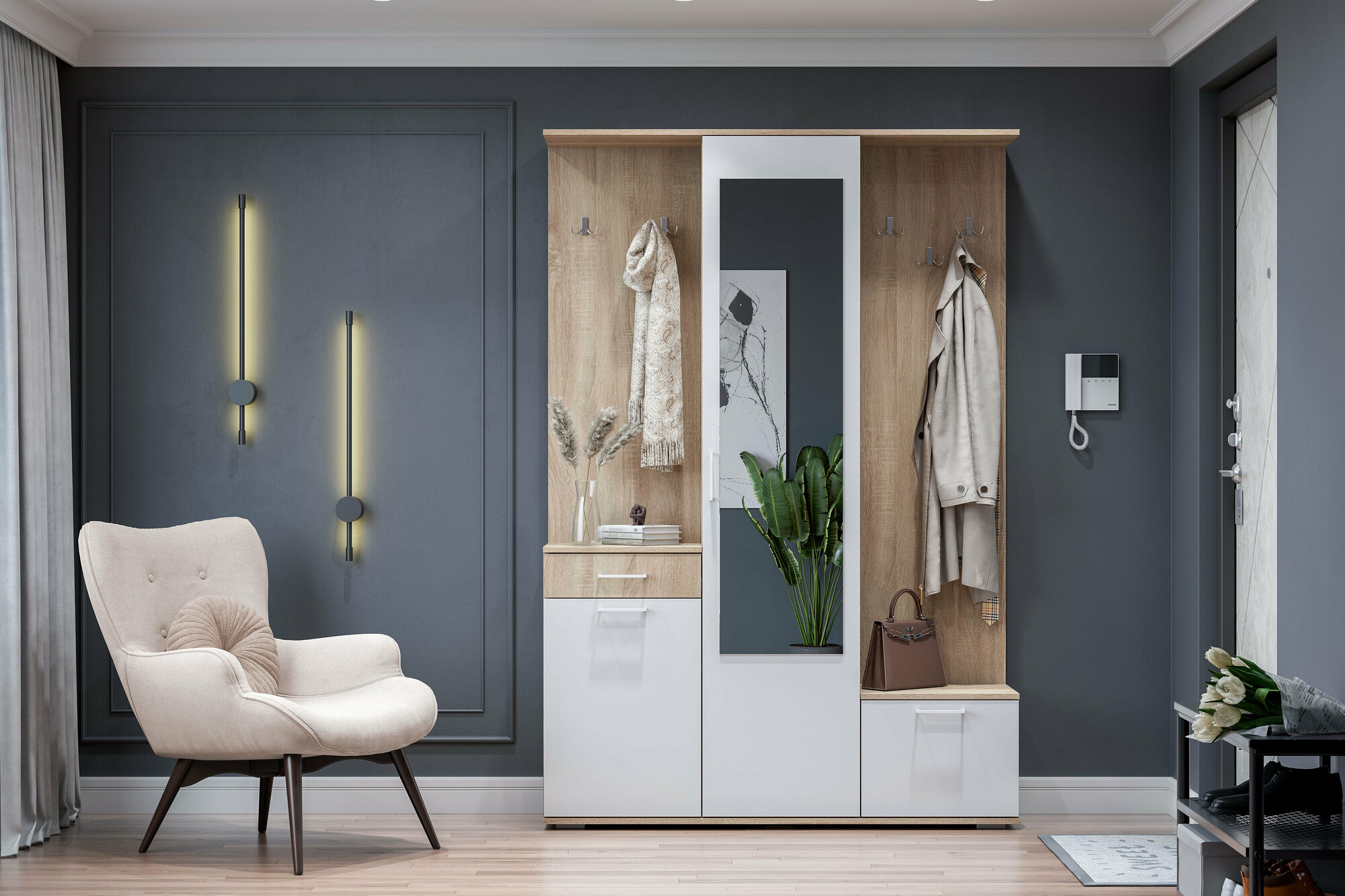 | Особенности | для узкой прихожей, с местом для сидения, шкаф с зеркалом |