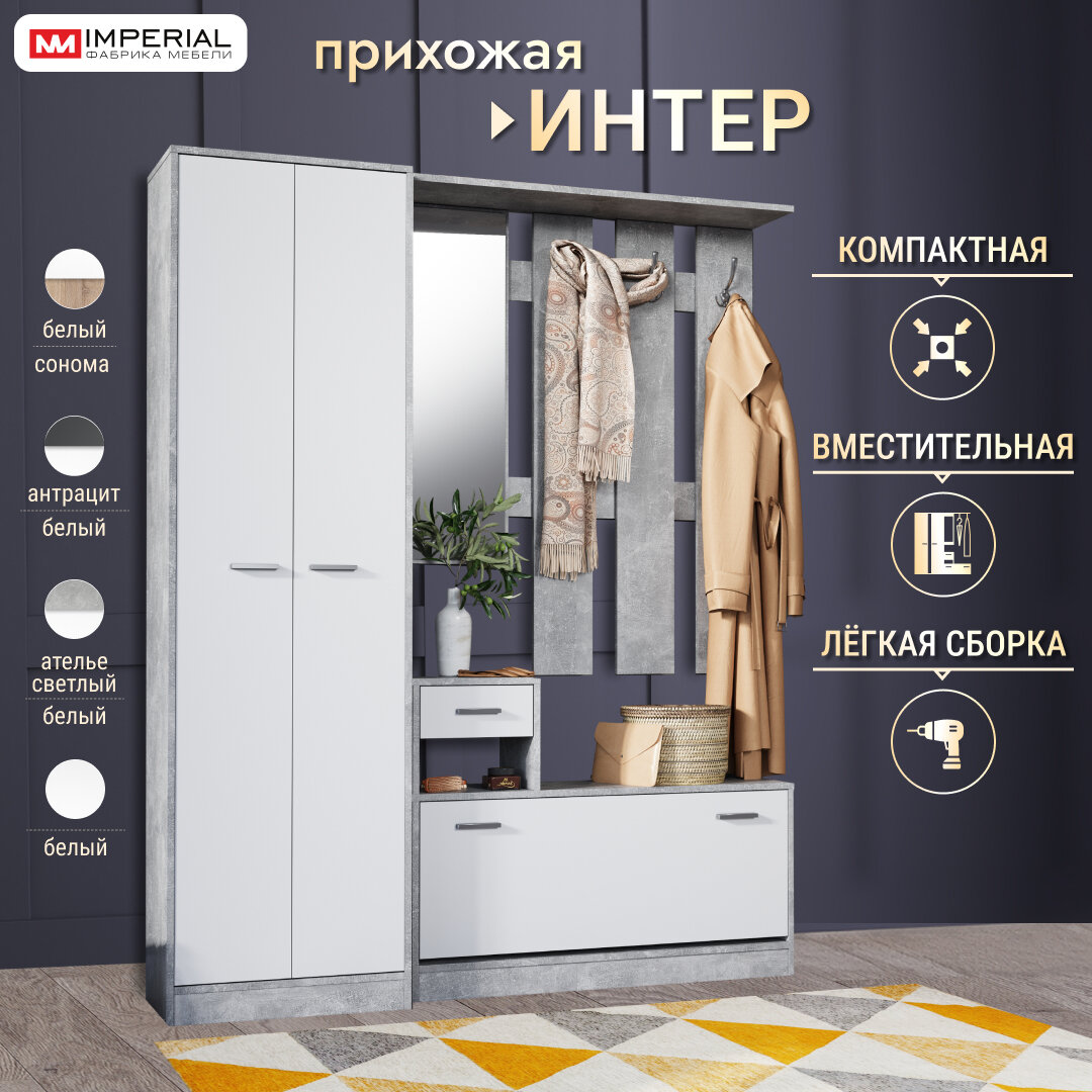 Ниже Вы можете прочитать отзывы на Прихожая Интер со шкафом, тумбой, вешалкой ателье светлый белый ШГВ 156х33х191.5 см, ознакомится с подробными характеристиками, посмотреть интересные обзоры и фотографии на Прихожая Интер со шкафом, тумбой, вешалкой ателье светлый белый ШГВ 156х33х191.5 см.