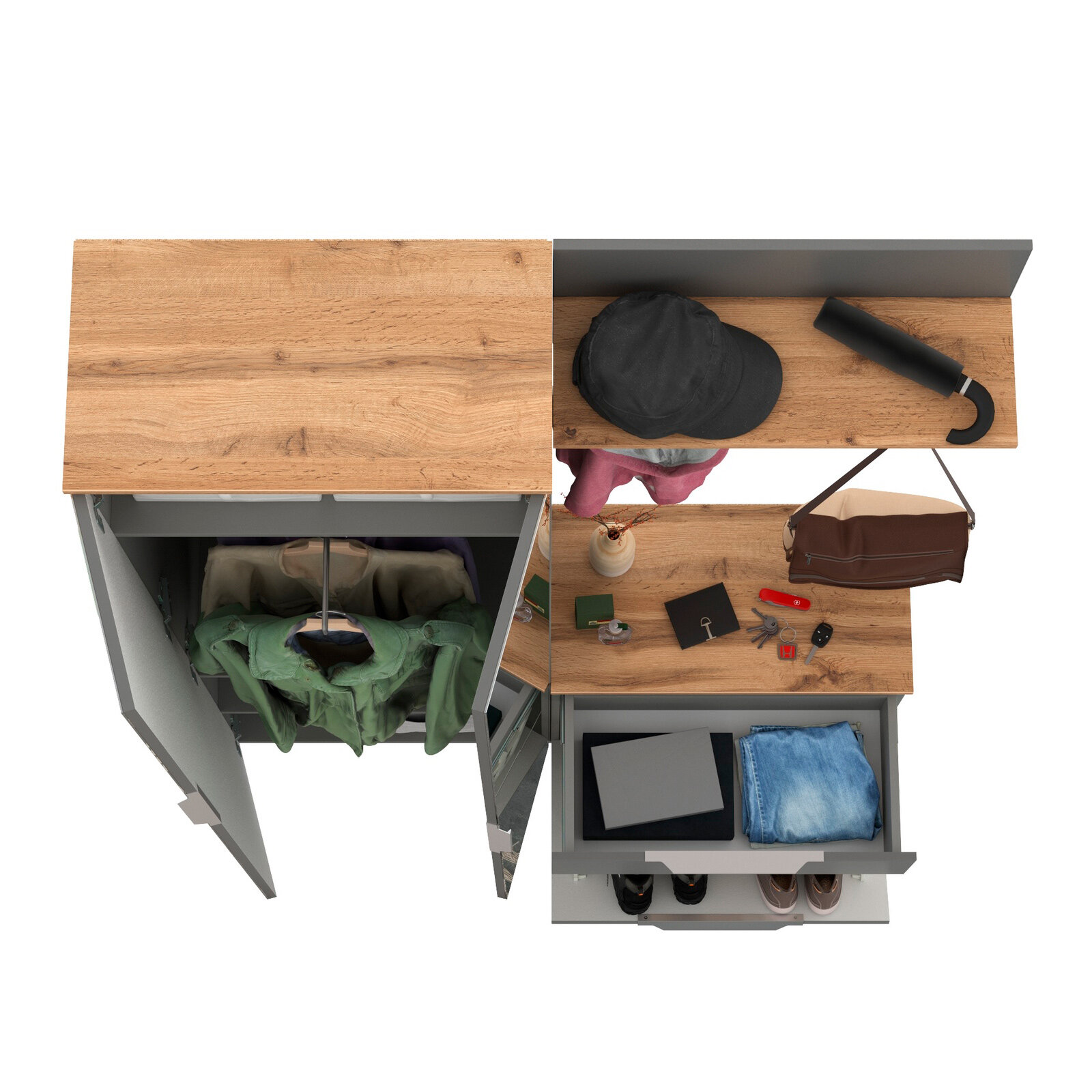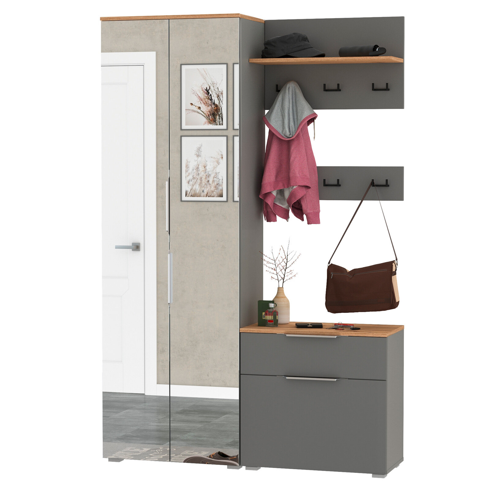 Компактная мебель для прихожей Моби Октава № 12 цвет серый графит/дуб крафт золотой, 129,3х35,4х197,6 см интересное: