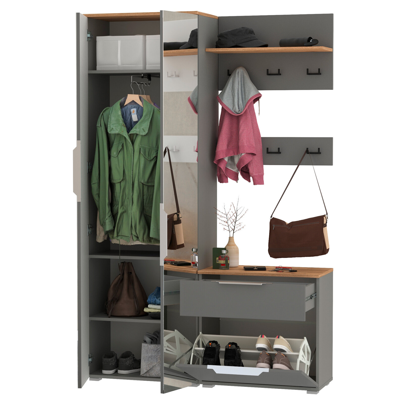 Прихожая комплект САША-6 (правая) от Фант-Мебель, с зеркалом, с обувницей, шкафом и ящиками, 156x203,6x43 см. Ясень темный/Ясень светлый