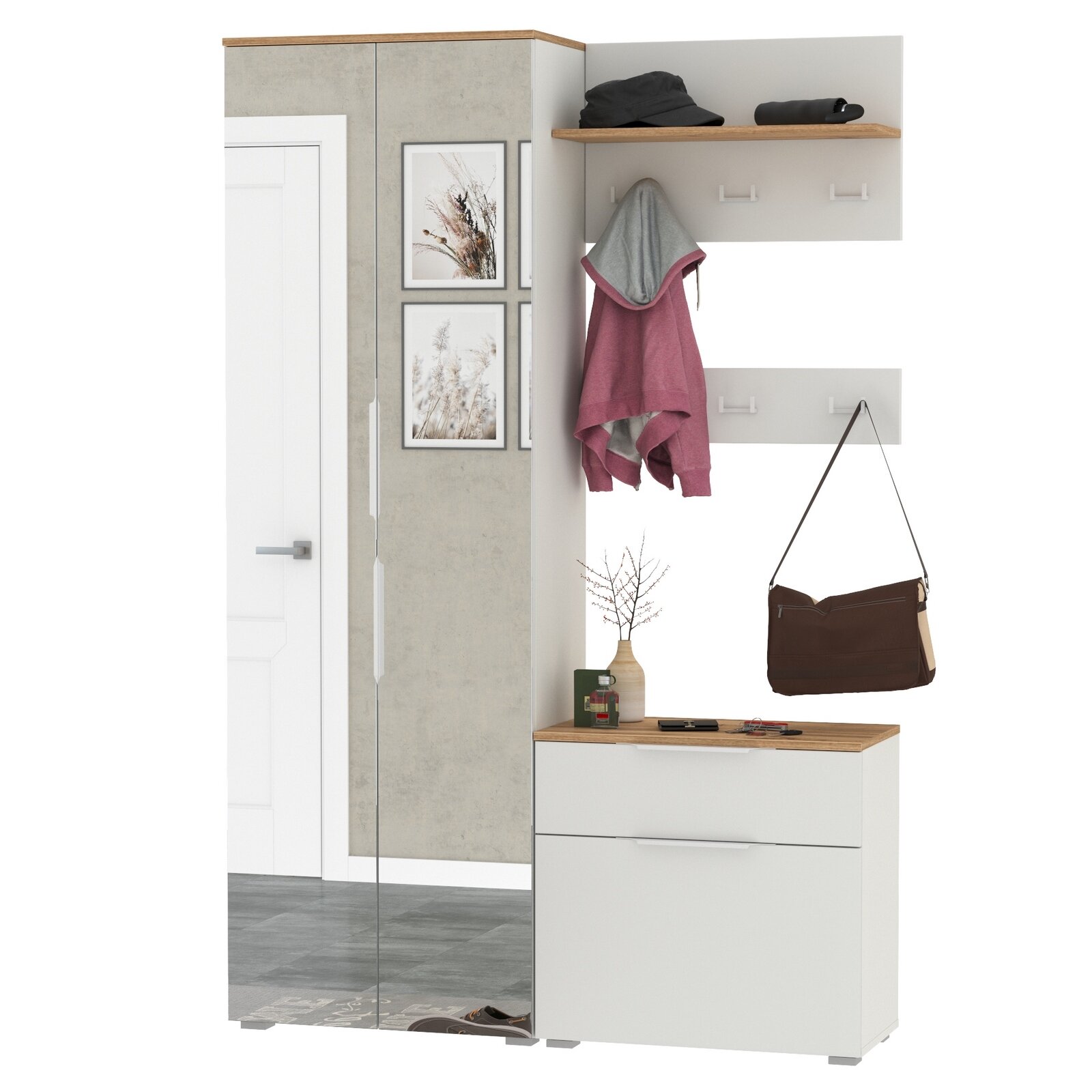 Прихожая комплект САША-6 (правая) от Фант-Мебель, с зеркалом, с обувницей, шкафом и ящиками, 156x203,6x43 см. Ясень темный/Ясень светлый