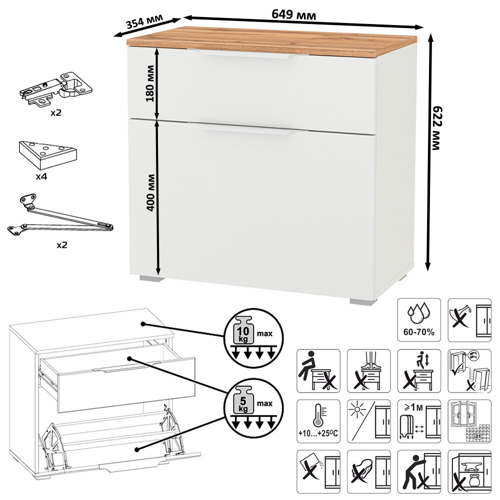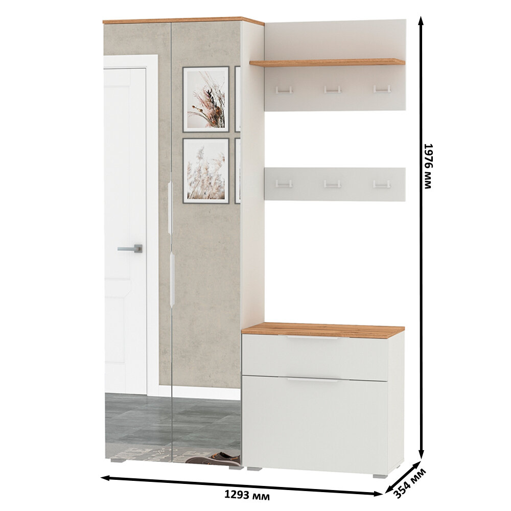 | Габариты | комплекта - 129,3х35,4х197,6 см, тумбы для обуви - 64,9х35,4х62,2 см, вешалки с полочкой - 64,7х23,6х40 см, вешалки - 64,7х5х15 см, шкафа - 64,4х35,3х197,6 см |