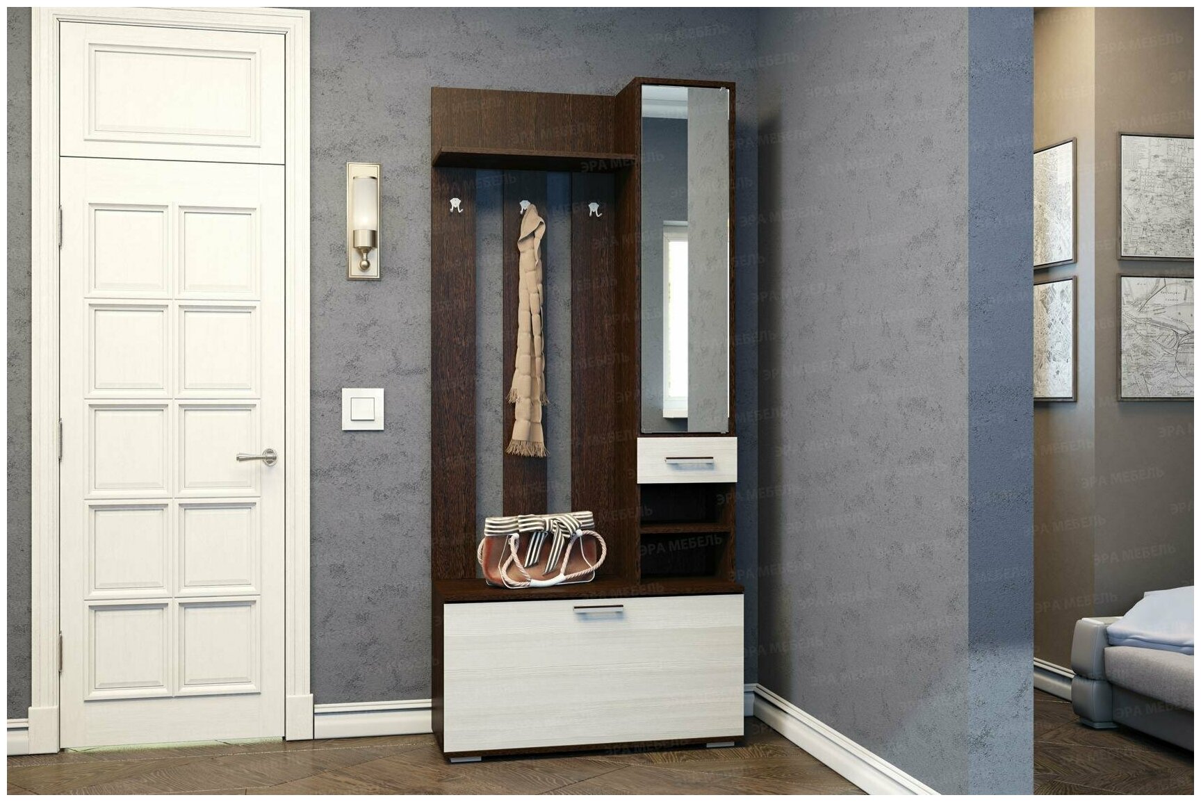 Прихожая комплект САША-6 (правая) от Фант-Мебель, с зеркалом, с обувницей, шкафом и ящиками, 156x203,6x43 см. Ясень темный/Ясень светлый