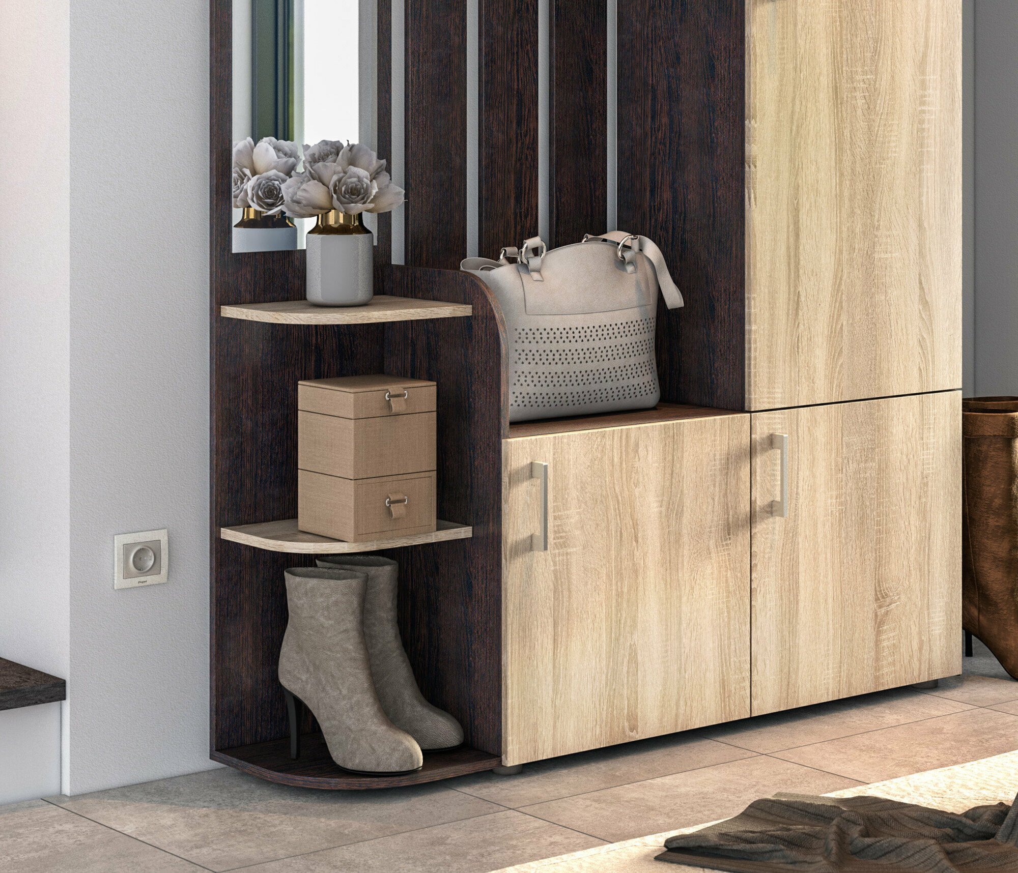 Прихожая комплект САША-6 (правая) от Фант-Мебель, с зеркалом, с обувницей, шкафом и ящиками, 156x203,6x43 см. Ясень темный/Ясень светлый