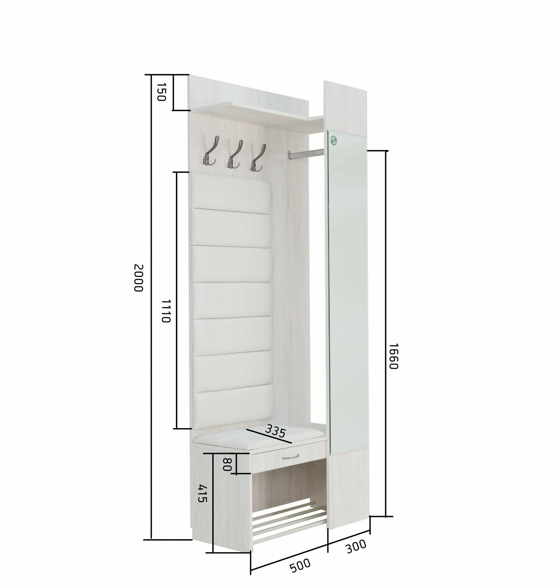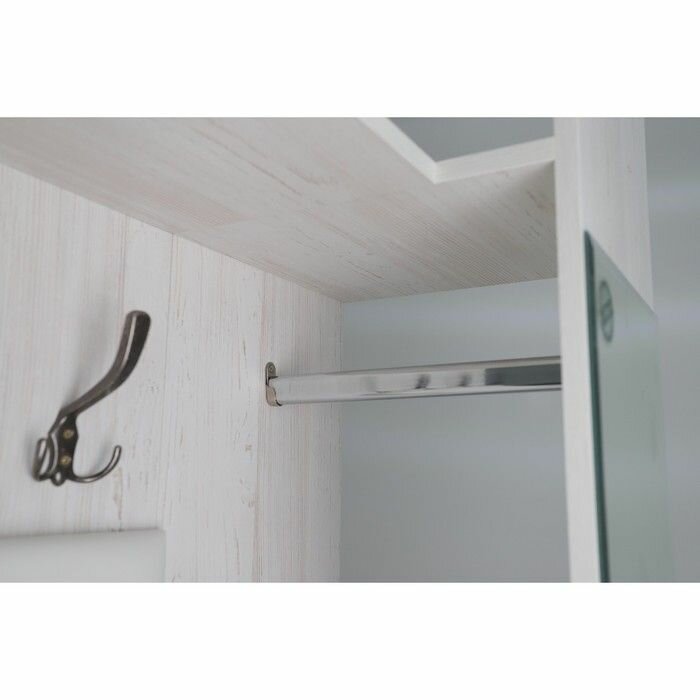 | Состав комплекта | Модуль прихожей оснащен большим зеркалом / штангой для одежды / а также крючками и верхними полочками. Встроенная тумба с выдвижным ящиком имеет открытую полку для обуви. |